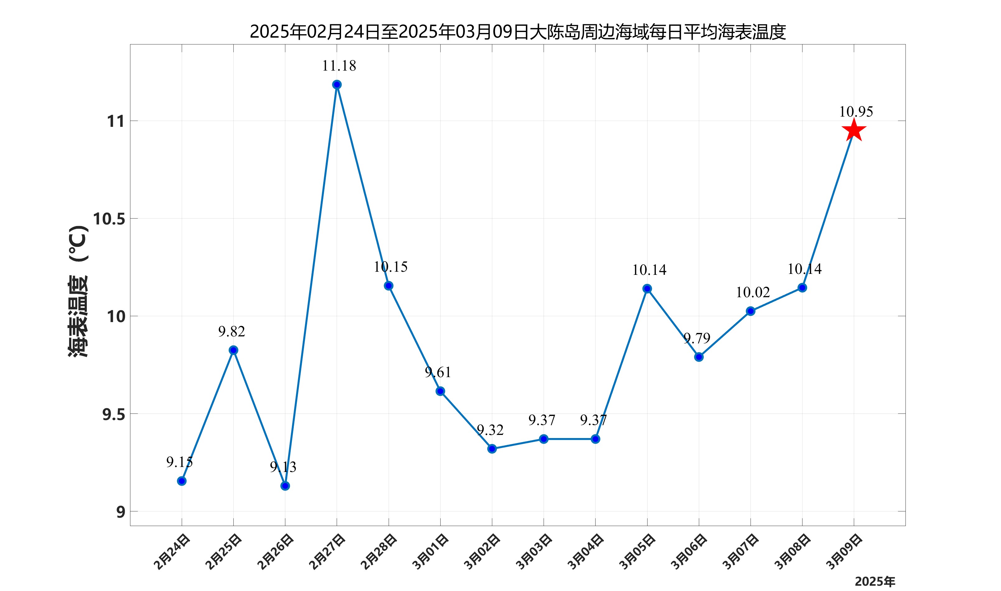 2025年3月9日,大陈岛周边海域日平均海表温度为10.95℃,近两周每日平均海表温度变化如下图所示。