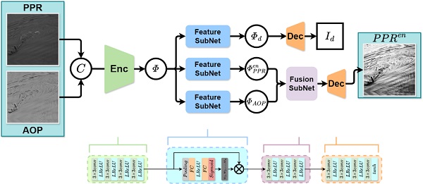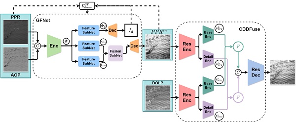 何贤强研究员前期创新提出了基于平行偏振辐射分量(PPR)的水色偏振遥感新概念,表明PPR能有效减少水面耀斑的影响。基于该发现,本研究融合线偏振度 (DOLP)、偏振角 (AOP) 与平行偏振辐射 (PPR) 等多种偏振特征,构建了GFNet模型,显著提升了水面目标的检测与分割能力。进一步引入了相关驱动特征分解融合 (CDDFuse) 网络,构建了GF-CDDFuse目标分割网络,针对低频和高频特征进行分离与融合,有效抑制水面耀斑对分割精度的影响(图1为GF-CDDFuse模型算法结构图,图2为GFNet模型算法结构图)。