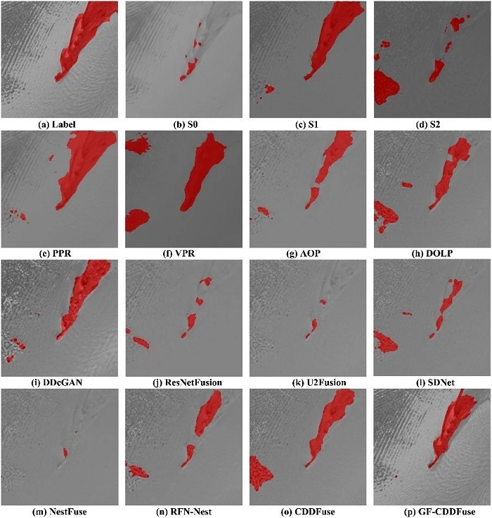 图4. 基于FastSCNN语义分割模型,采用7种偏振参数和7种SOTA融合方法,对2024年1月30日13:55采集的图像进行UUV分割。UUV标签显示在(a)中,其中UUV标记为红色。