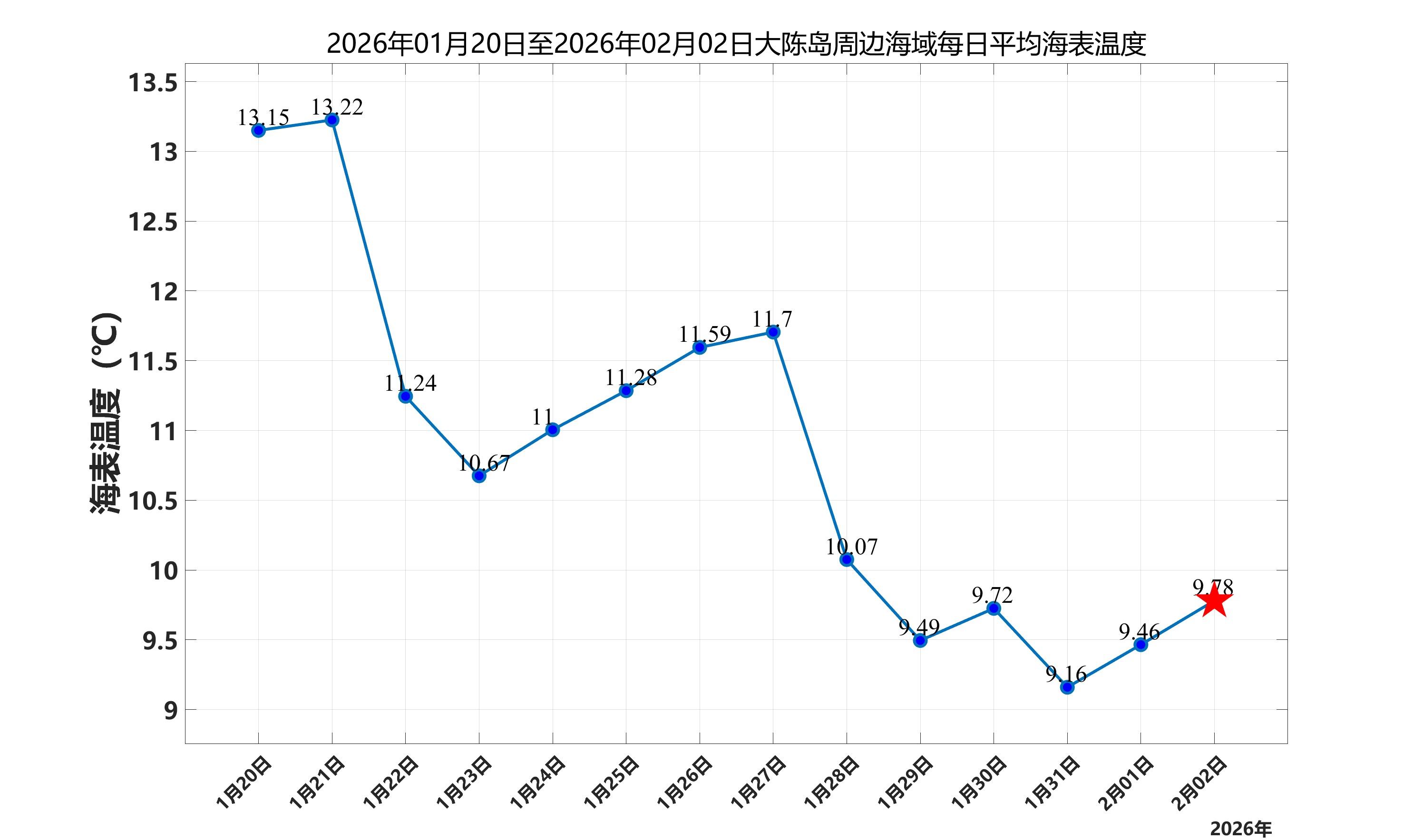 2026年2月2日,大陈岛周边海域日平均海表温度为9.78℃,近两周每日平均海表温度变化如下图所示。