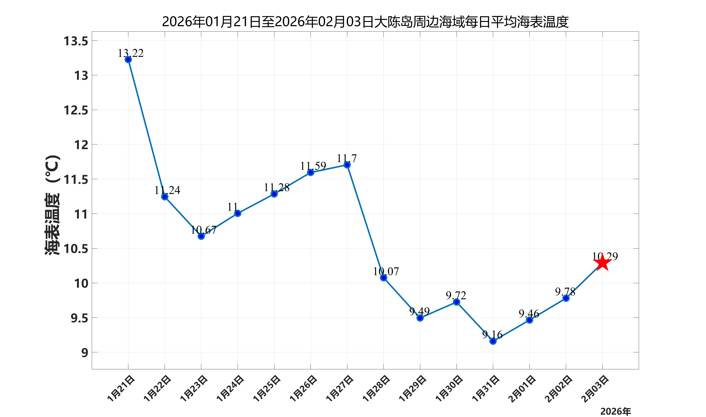 2026年2月3日,大陈岛周边海域日平均海表温度为10.29℃,近两周每日平均海表温度变化如下图所示。