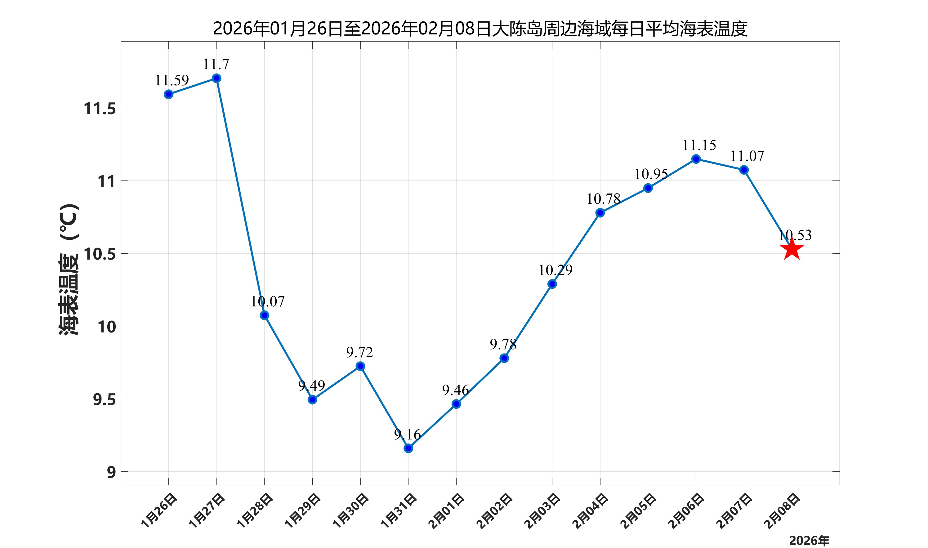 2026年2月8日,大陈岛周边海域日平均海表温度为10.53℃,近两周每日平均海表温度变化如下图所示。