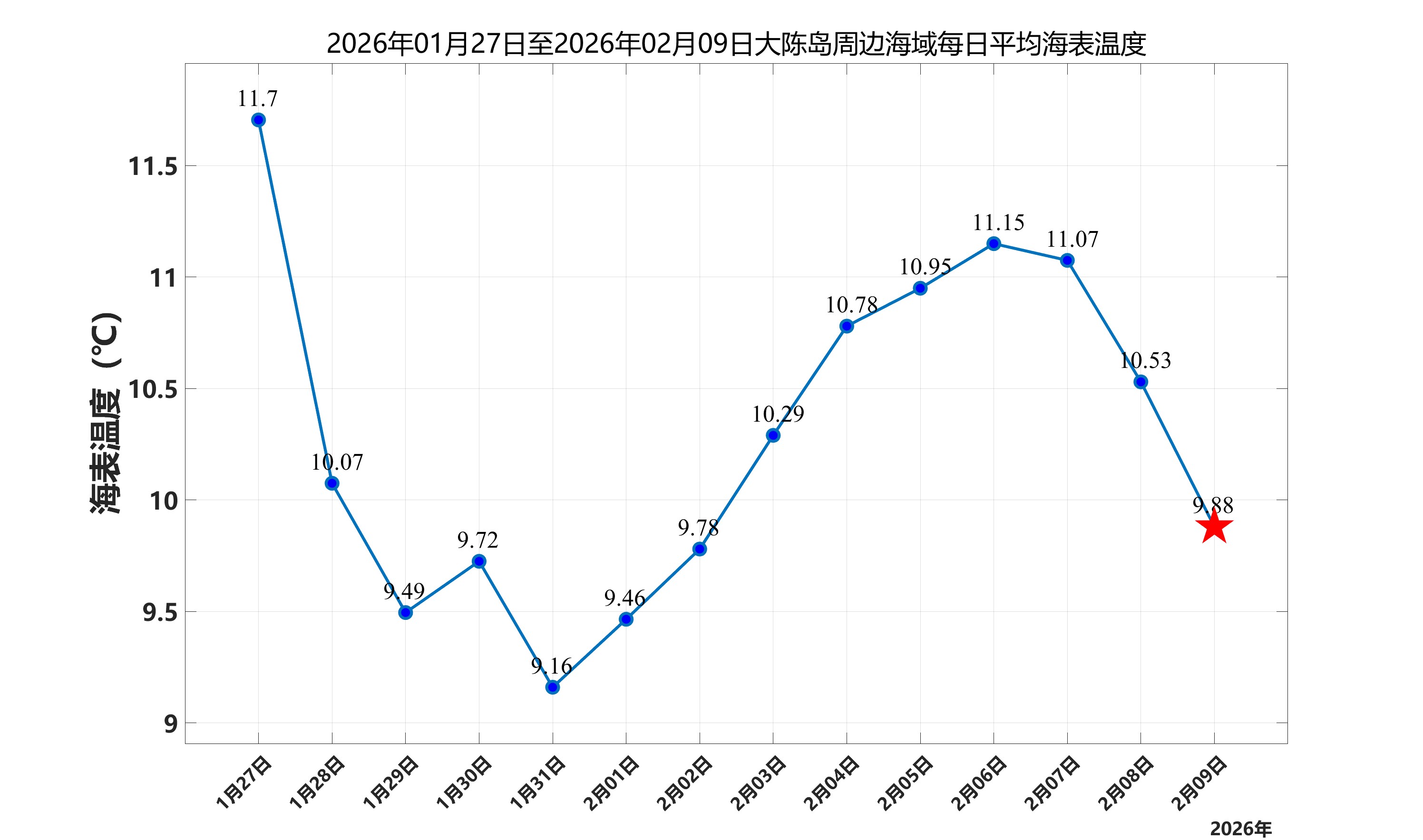 2026年2月9日,大陈岛周边海域日平均海表温度为9.88℃,近两周每日平均海表温度变化如下图所示。