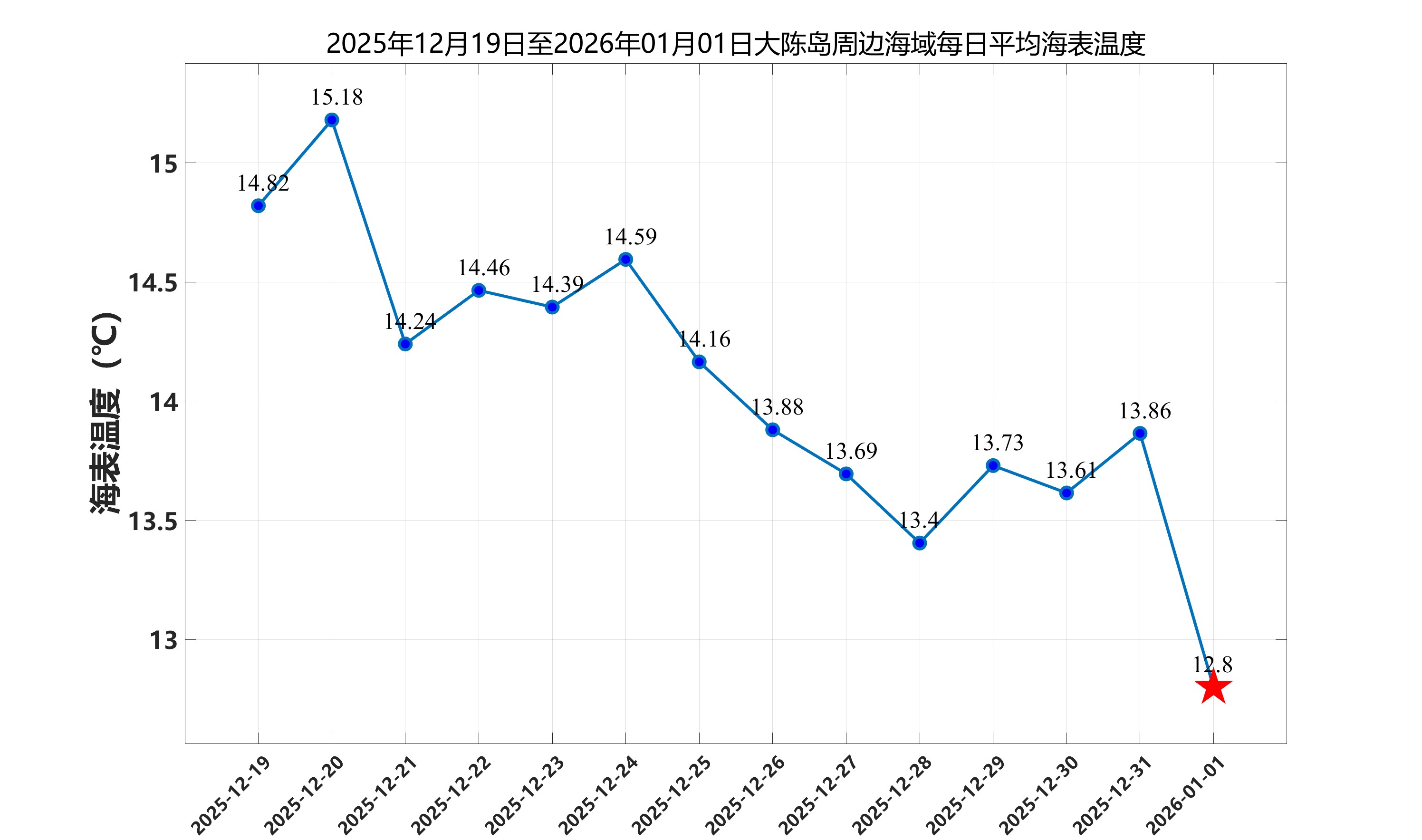 2026年1月1日,大陈岛周边海域日平均海表温度为12.80℃,近两周每日平均海表温度变化如下图所示。