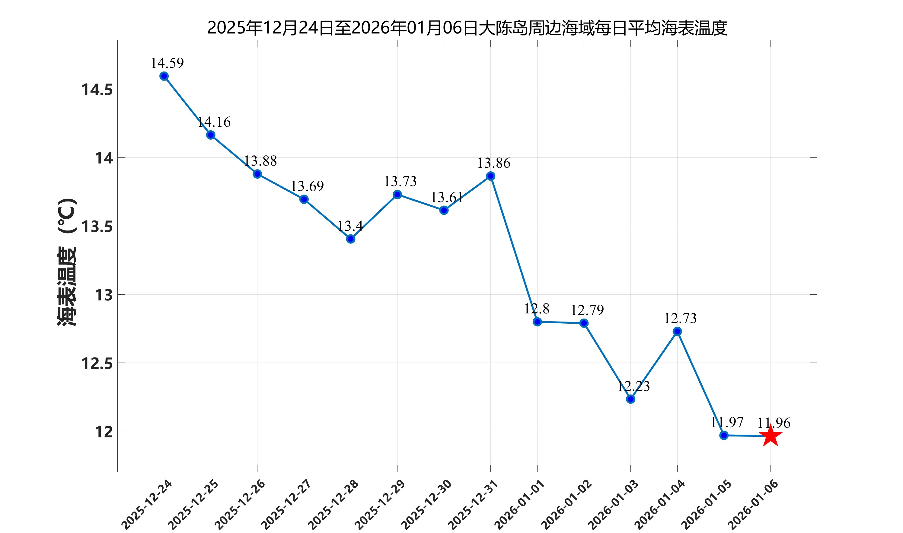 2026年1月6日,大陈岛周边海域日平均海表温度为11.96℃,近两周每日平均海表温度变化如下图所示。