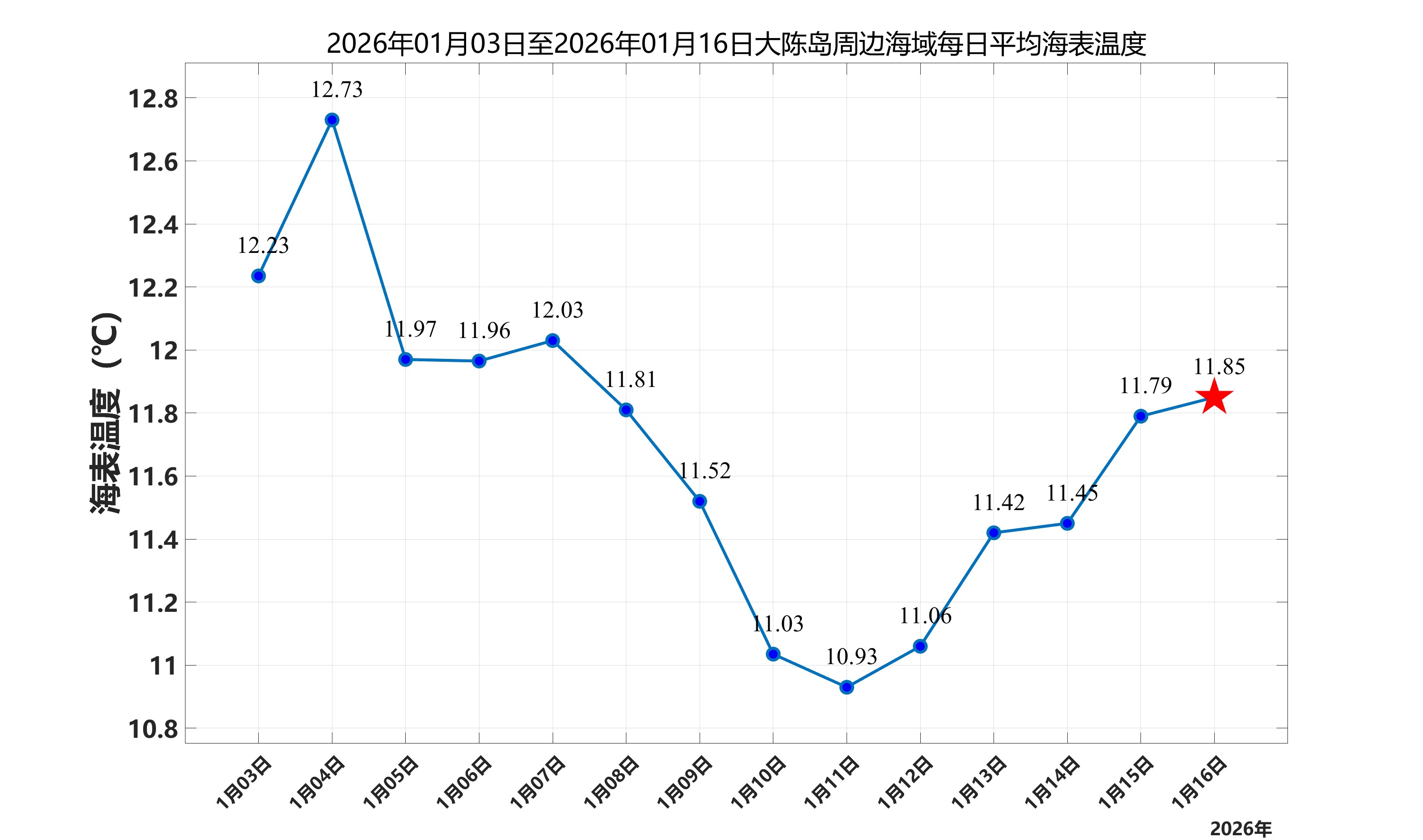 2026年1月16日,大陈岛周边海域日平均海表温度为11.85℃,近两周每日平均海表温度变化如下图所示。