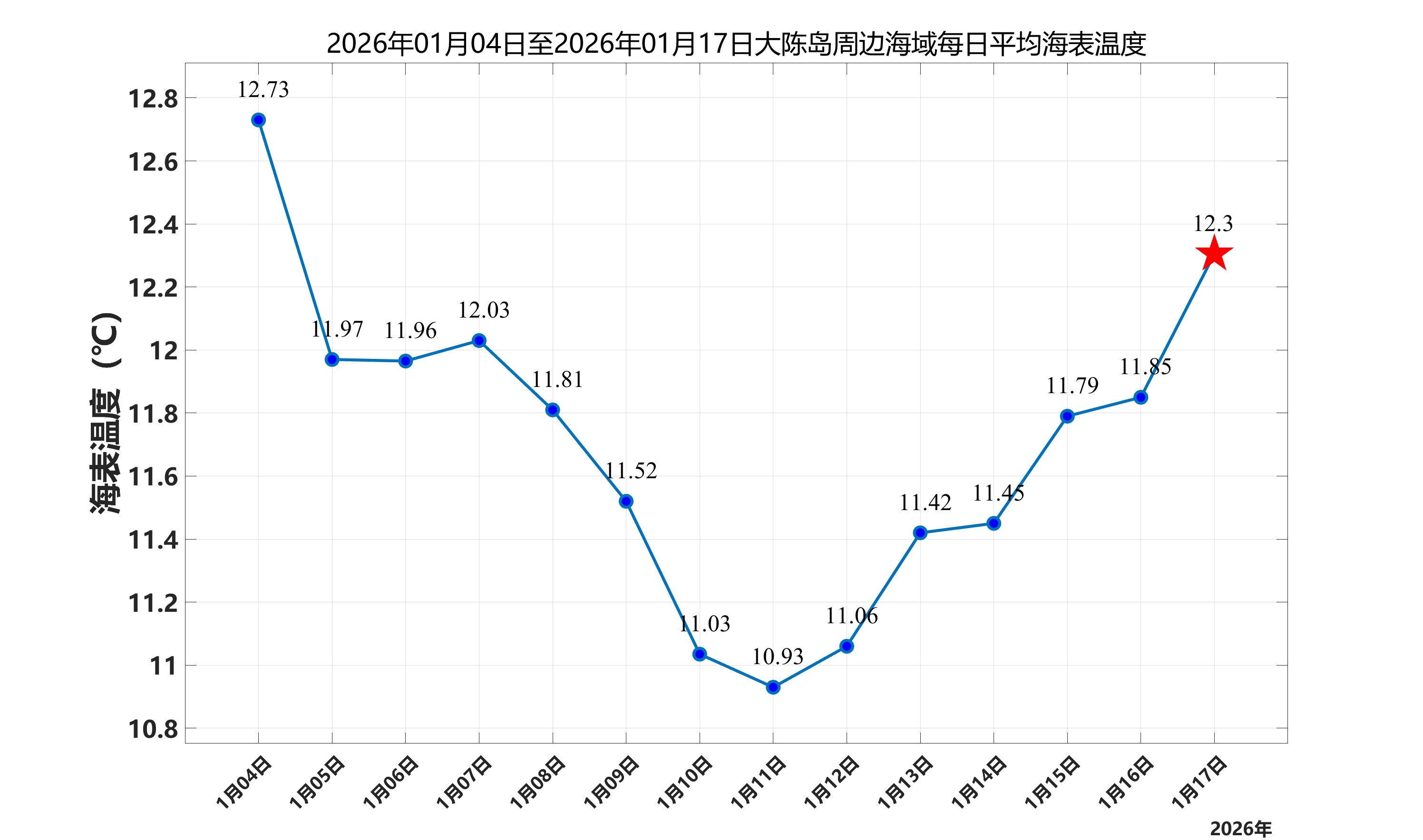 2026年1月17日,大陈岛周边海域日平均海表温度为12.30℃,近两周每日平均海表温度变化如下图所示。