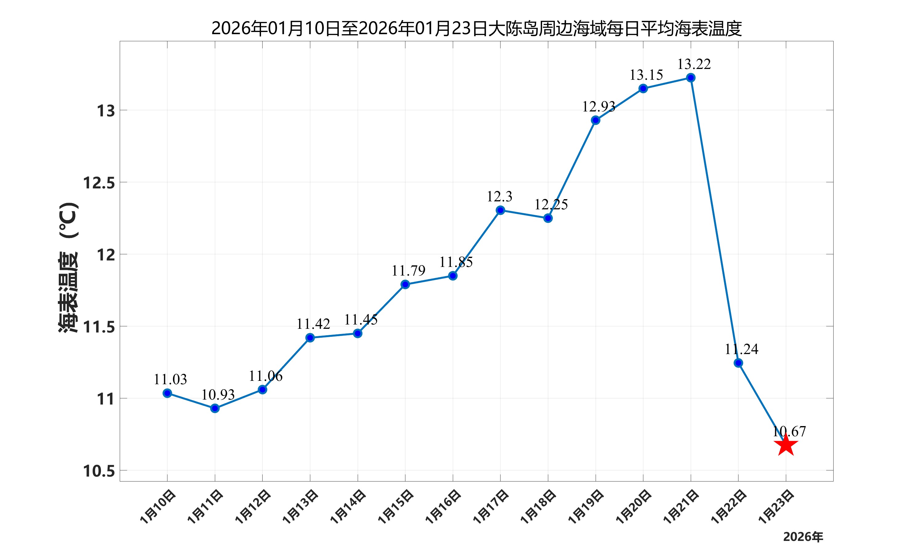 2026年1月23日,大陈岛周边海域日平均海表温度为10.67℃,近两周每日平均海表温度变化如下图所示。