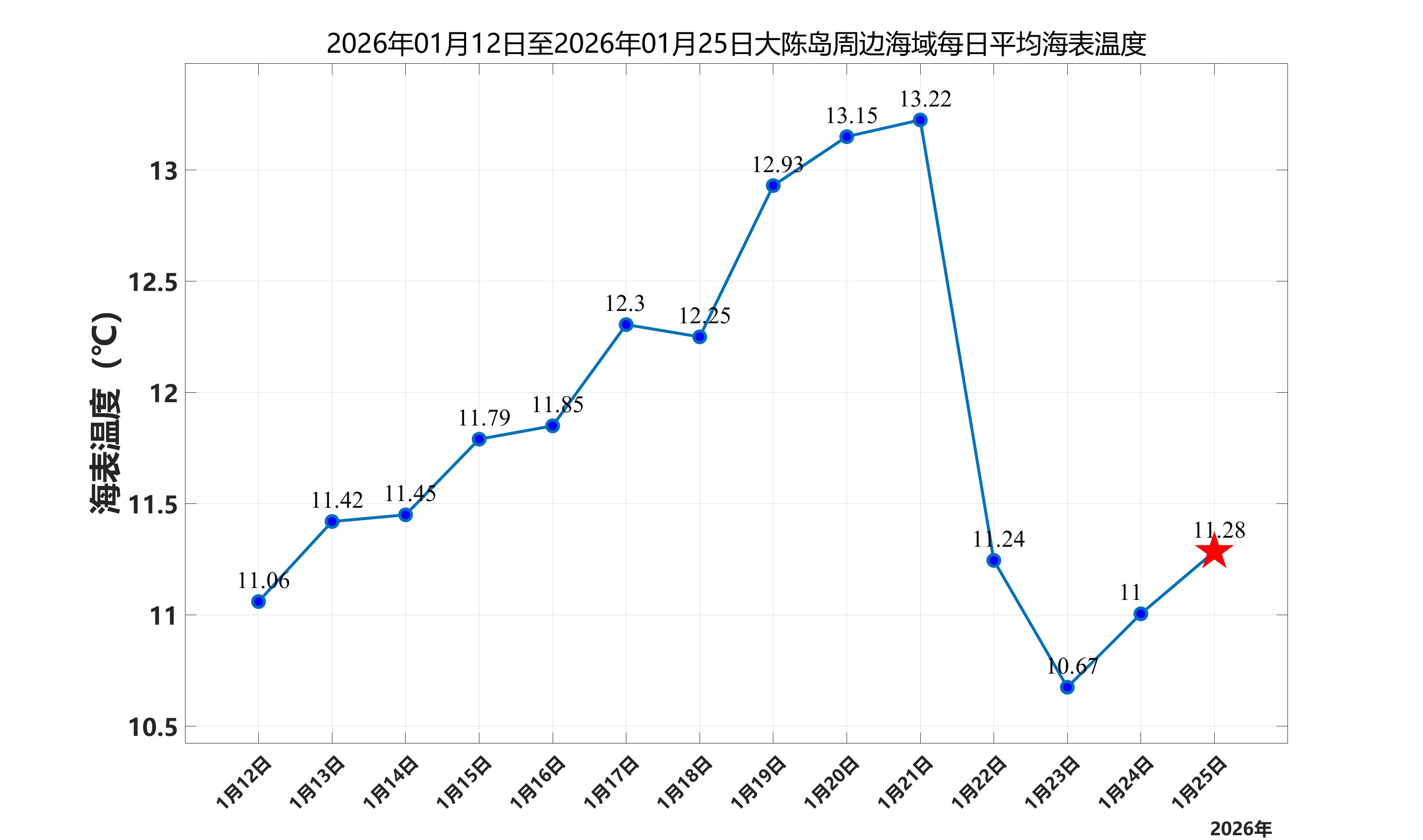 2026年1月25日,大陈岛周边海域日平均海表温度为11.28℃,近两周每日平均海表温度变化如下图所示。