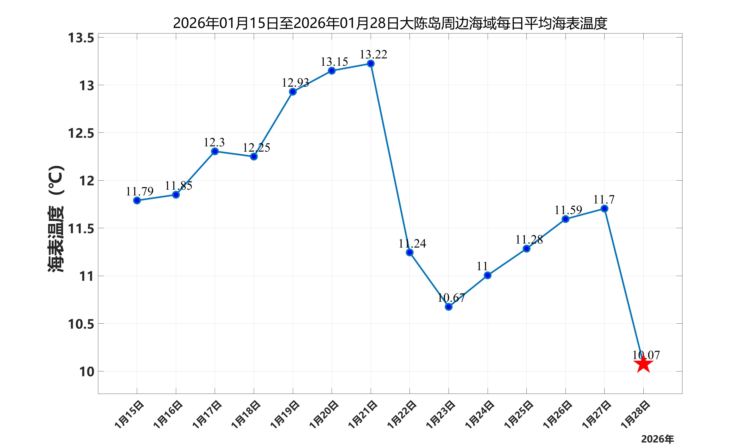 2026年1月28日,大陈岛周边海域日平均海表温度为10.07℃,近两周每日平均海表温度变化如下图所示。