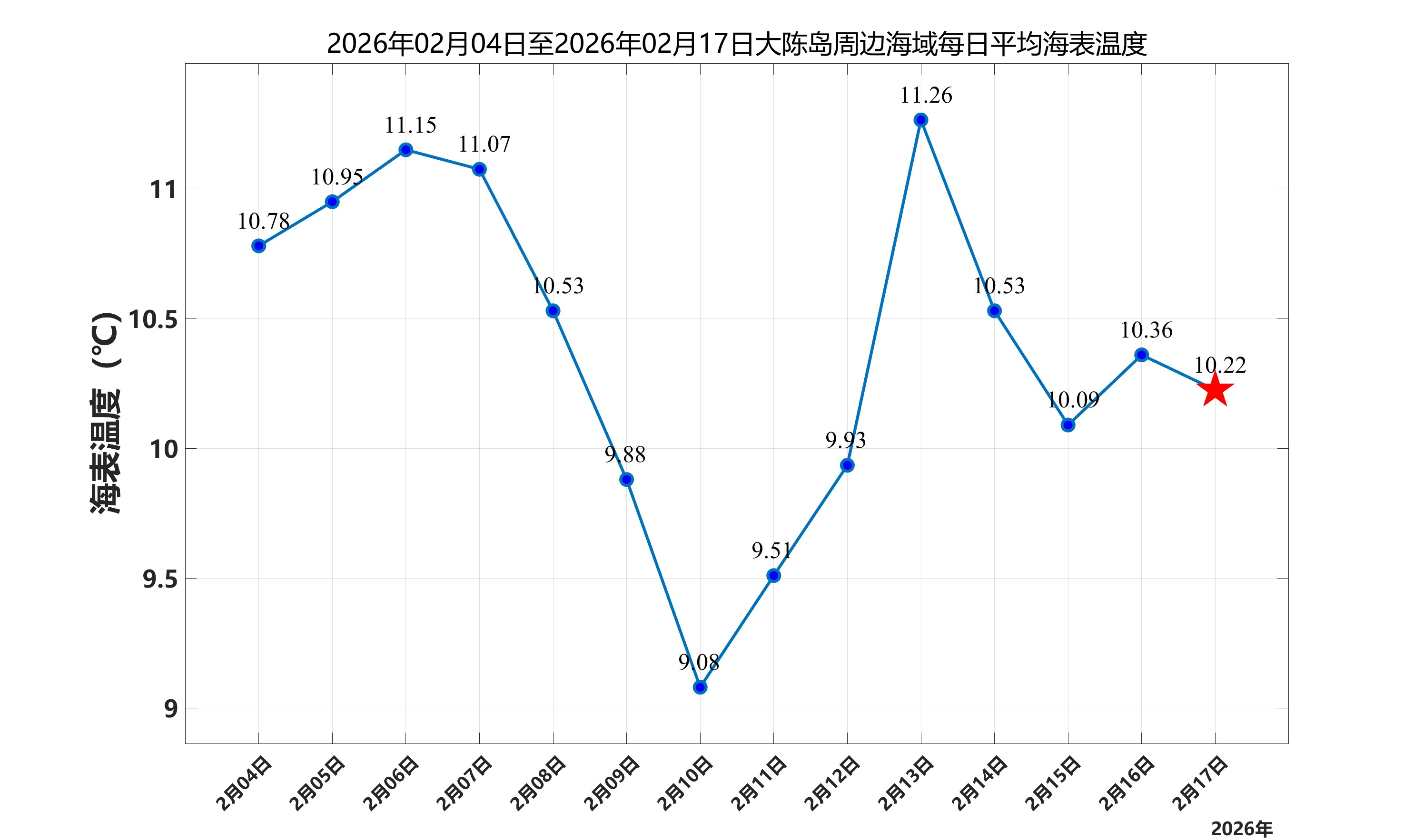 2026年2月17日,大陈岛周边海域日平均海表温度为10.22℃,近两周每日平均海表温度变化如下图所示。