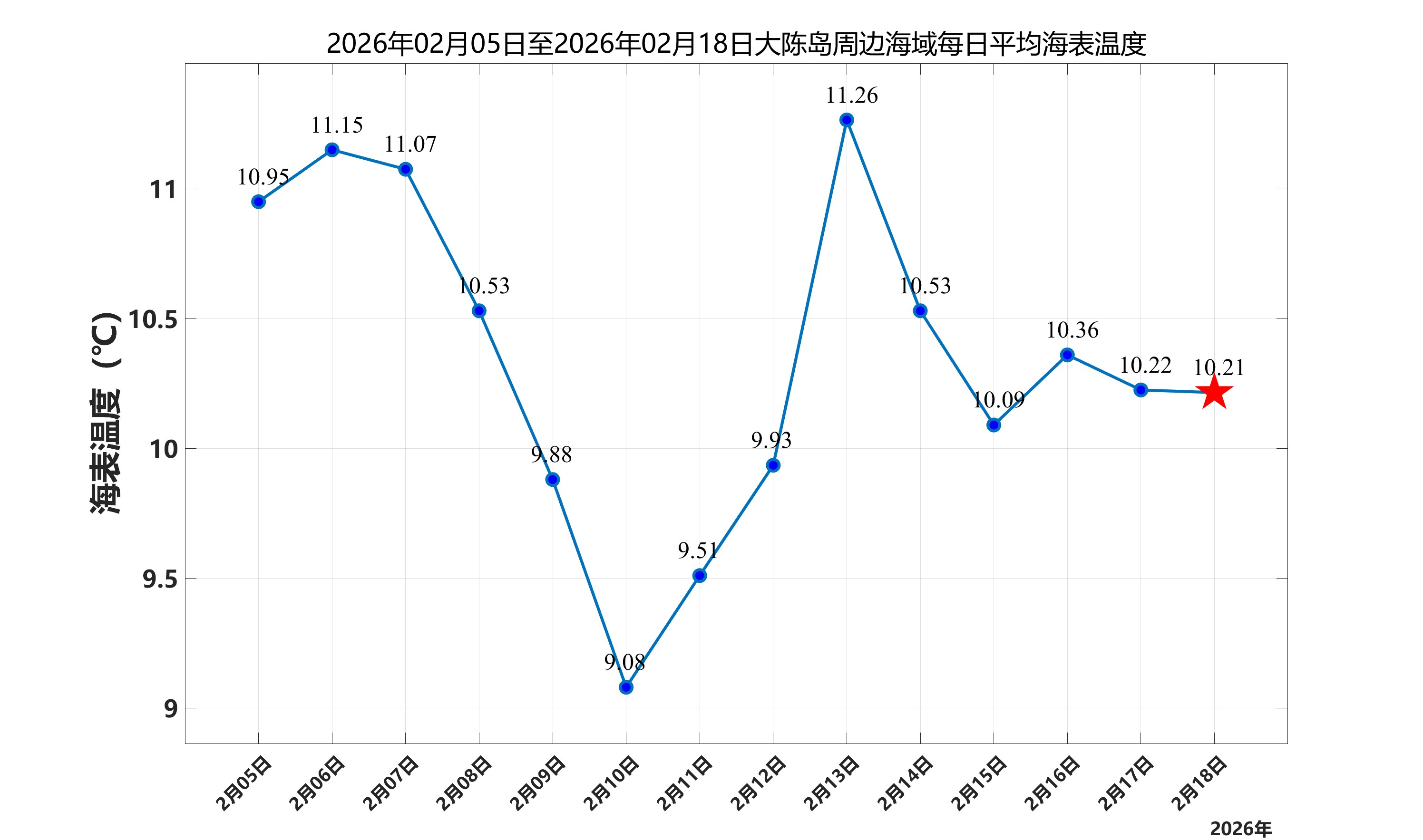 2026年2月18日,大陈岛周边海域日平均海表温度为10.21℃,近两周每日平均海表温度变化如下图所示。