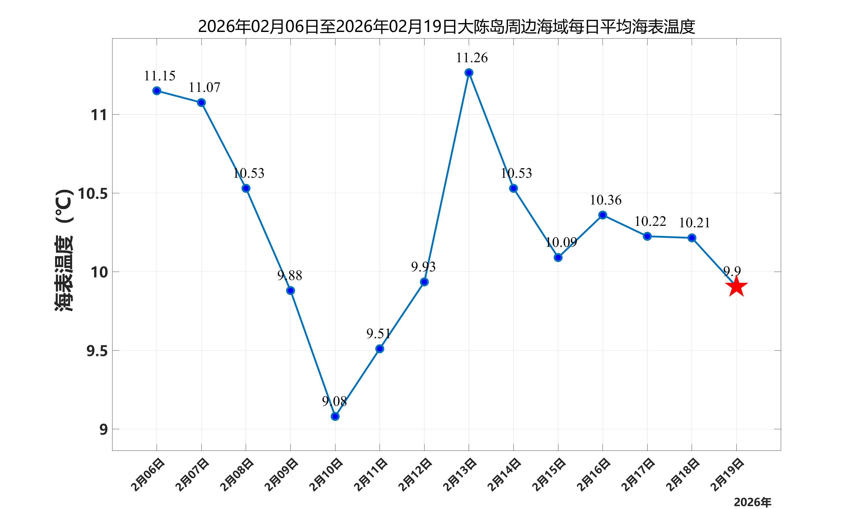2026年2月19日,大陈岛周边海域日平均海表温度为9.90℃,近两周每日平均海表温度变化如下图所示。