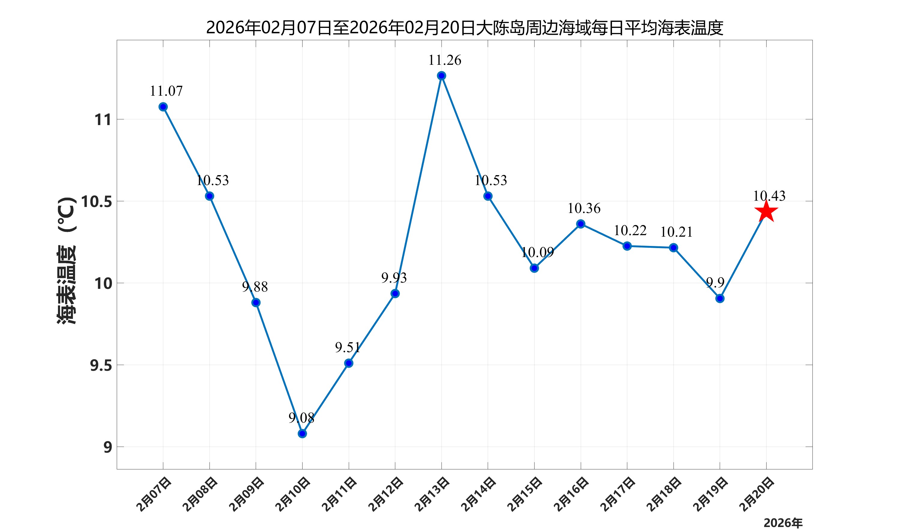 2026年2月20日,大陈岛周边海域日平均海表温度为10.43℃,近两周每日平均海表温度变化如下图所示。