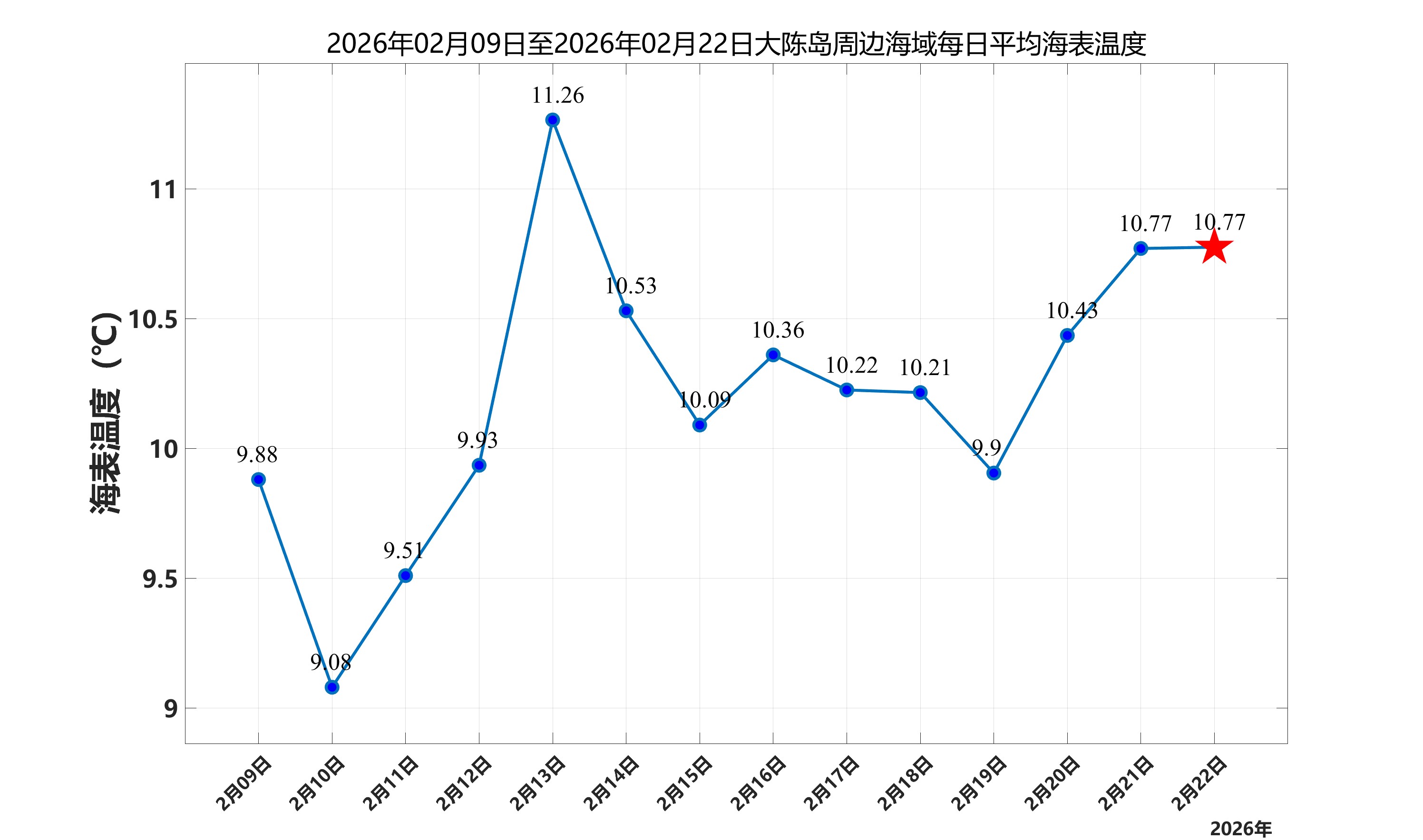 2026年2月22日,大陈岛周边海域日平均海表温度为10.77℃,近两周每日平均海表温度变化如下图所示。
