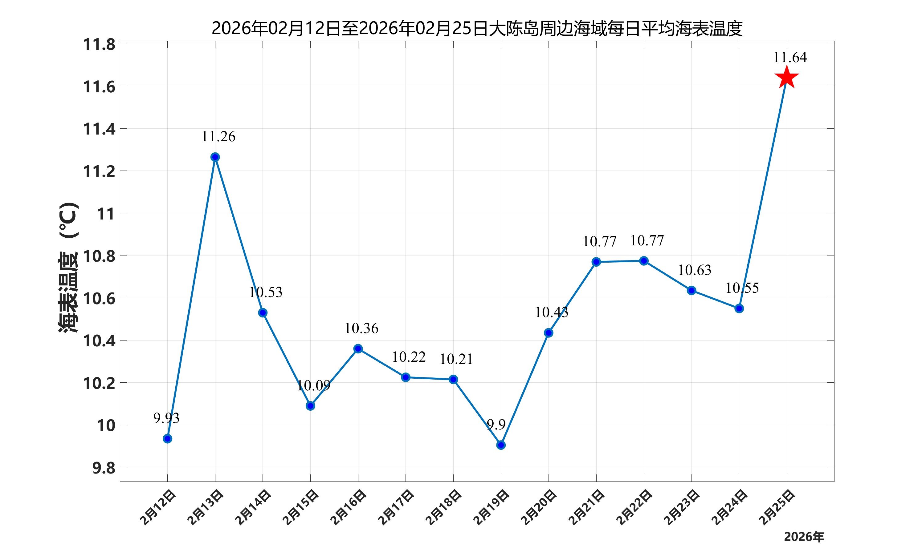 2026年2月25日,大陈岛周边海域日平均海表温度为11.64℃,近两周每日平均海表温度变化如下图所示。