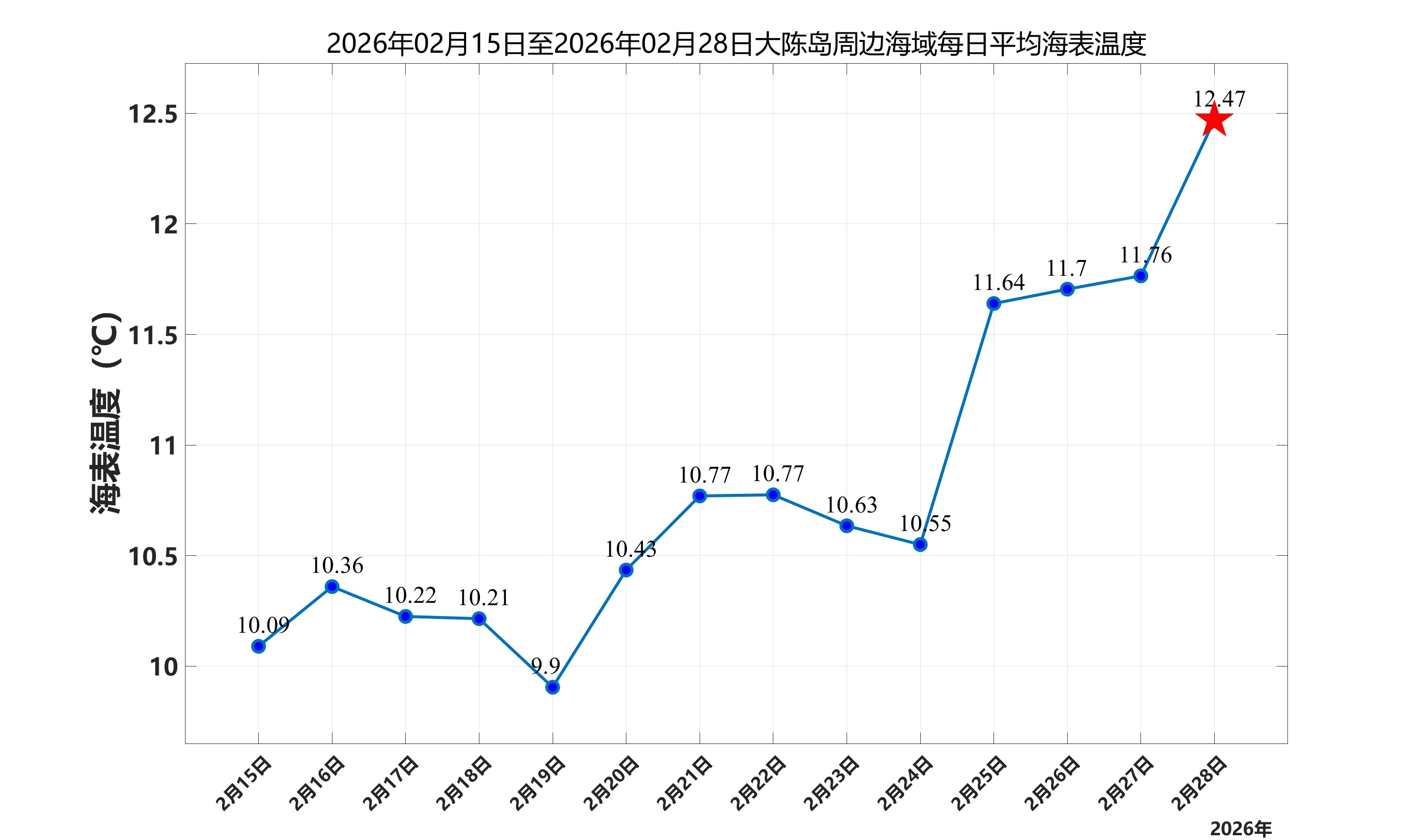 2026年2月28日,大陈岛周边海域日平均海表温度为12.47℃,近两周每日平均海表温度变化如下图所示。