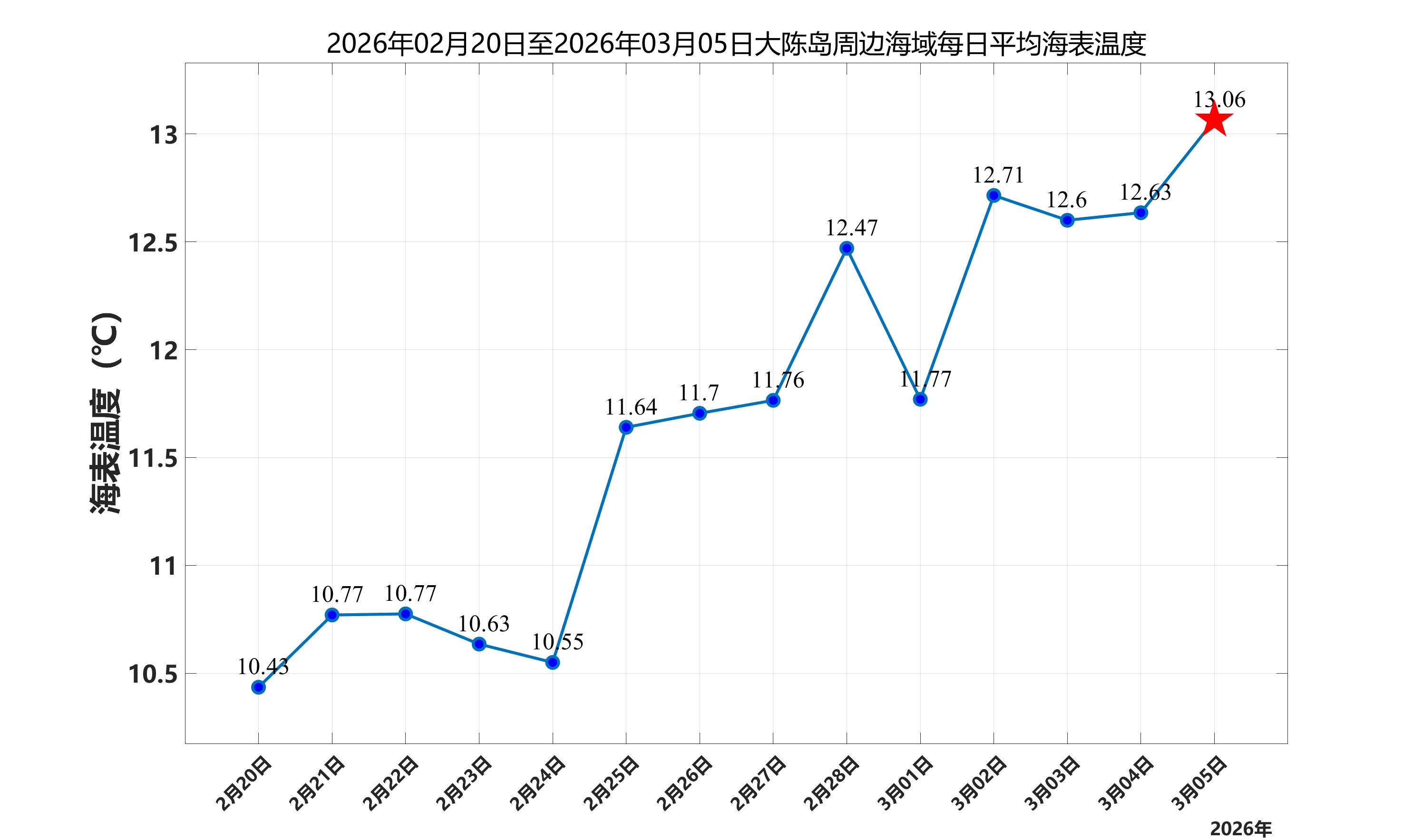 2026年3月5日,大陈岛周边海域日平均海表温度为13.06℃,近两周每日平均海表温度变化如下图所示。