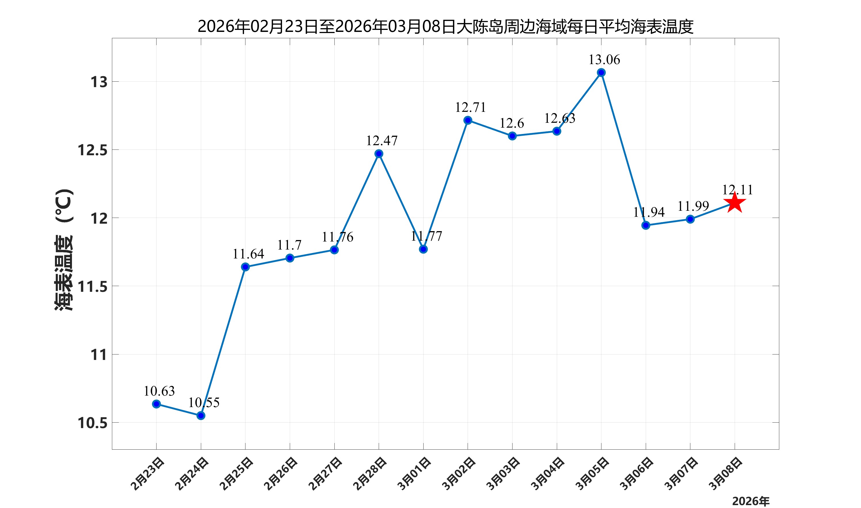 2026年3月8日,大陈岛周边海域日平均海表温度为12.11℃,近两周每日平均海表温度变化如下图所示。