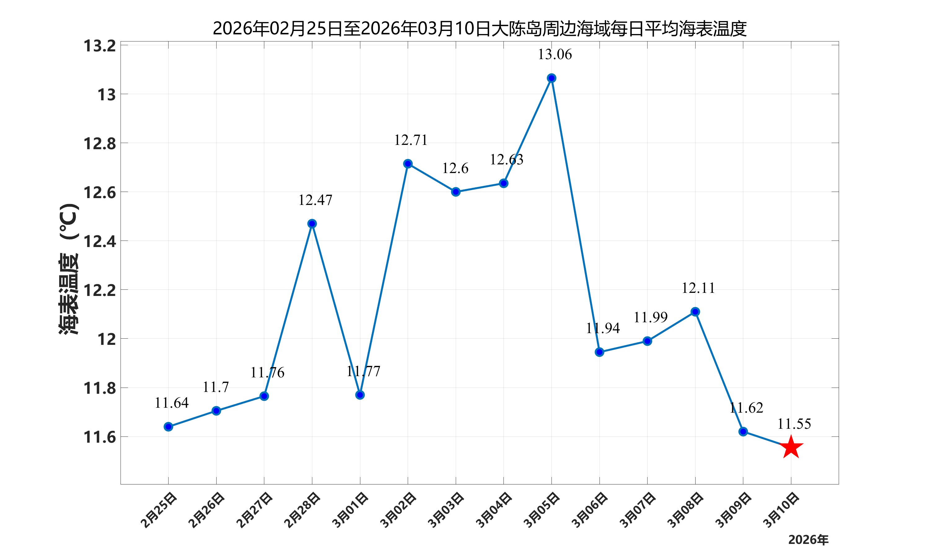2026年3月10日,大陈岛周边海域日平均海表温度为11.55℃,近两周每日平均海表温度变化如下图所示。