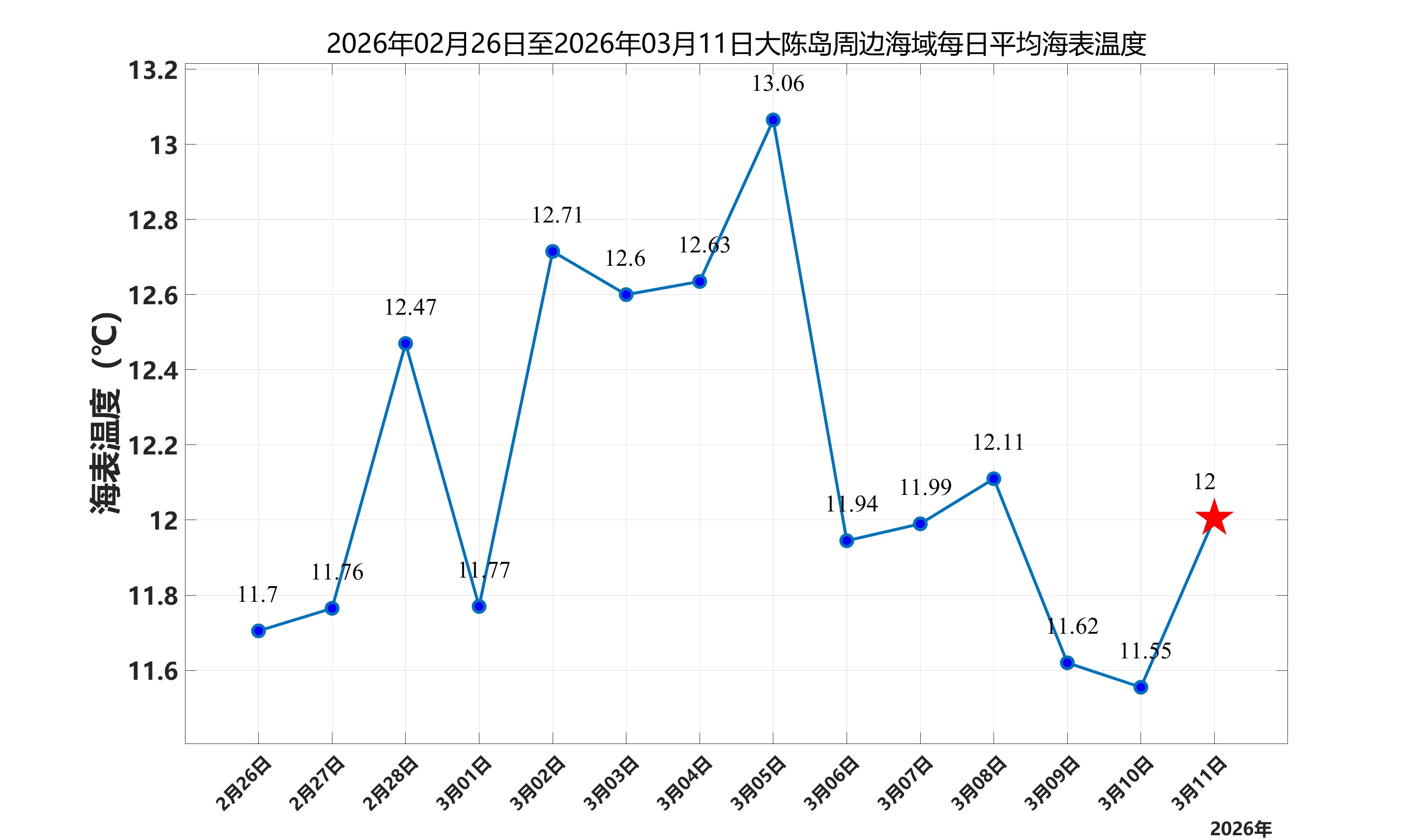 2026年3月11日,大陈岛周边海域日平均海表温度为12.00℃,近两周每日平均海表温度变化如下图所示。