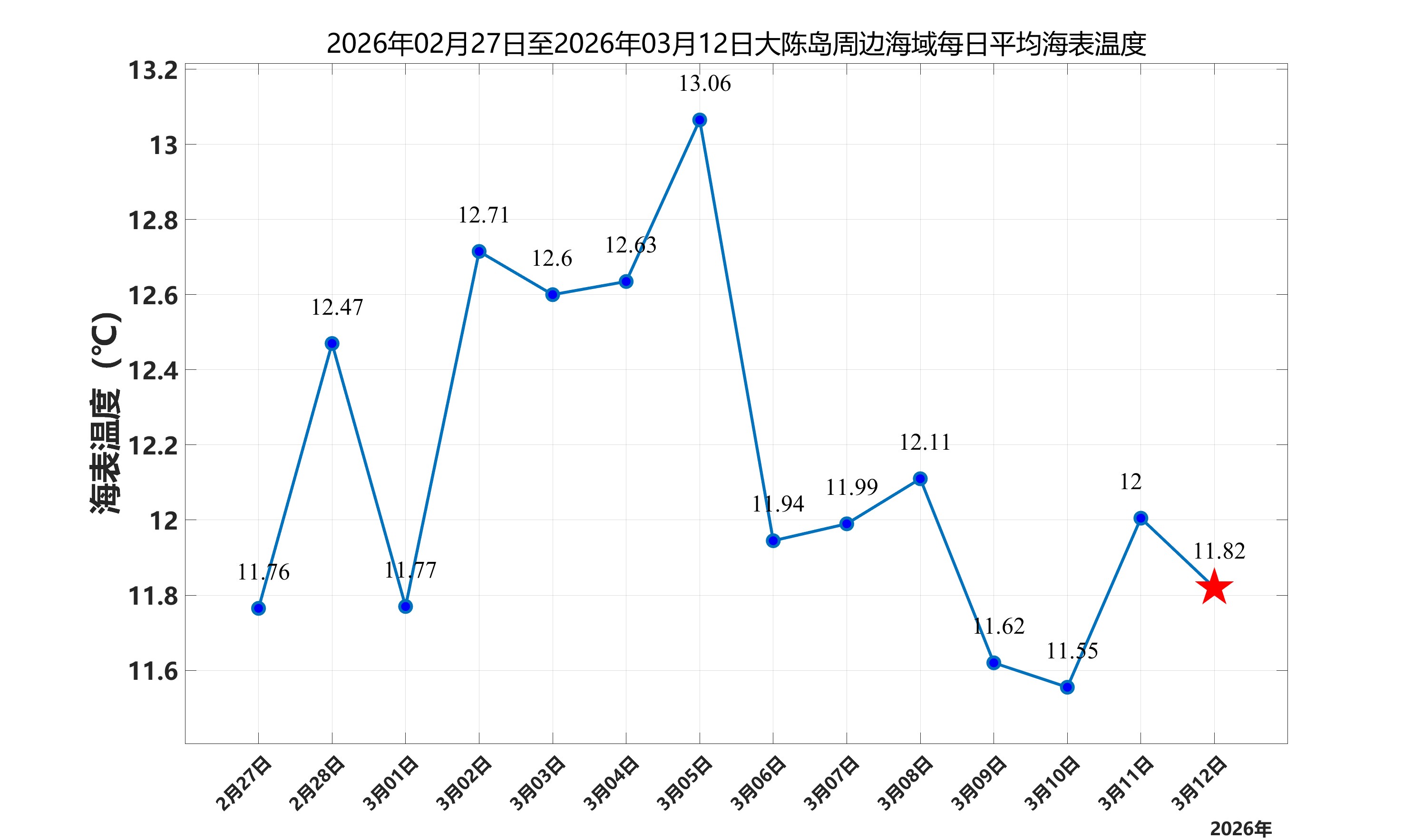 2026年3月12日,大陈岛周边海域日平均海表温度为11.82℃,近两周每日平均海表温度变化如下图所示。