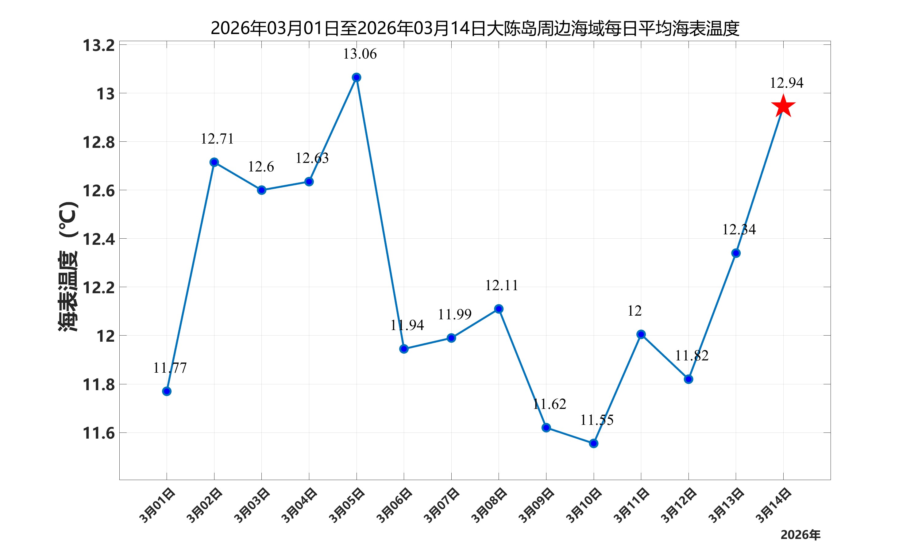2026年3月14日,大陈岛周边海域日平均海表温度为12.94℃,近两周每日平均海表温度变化如下图所示。