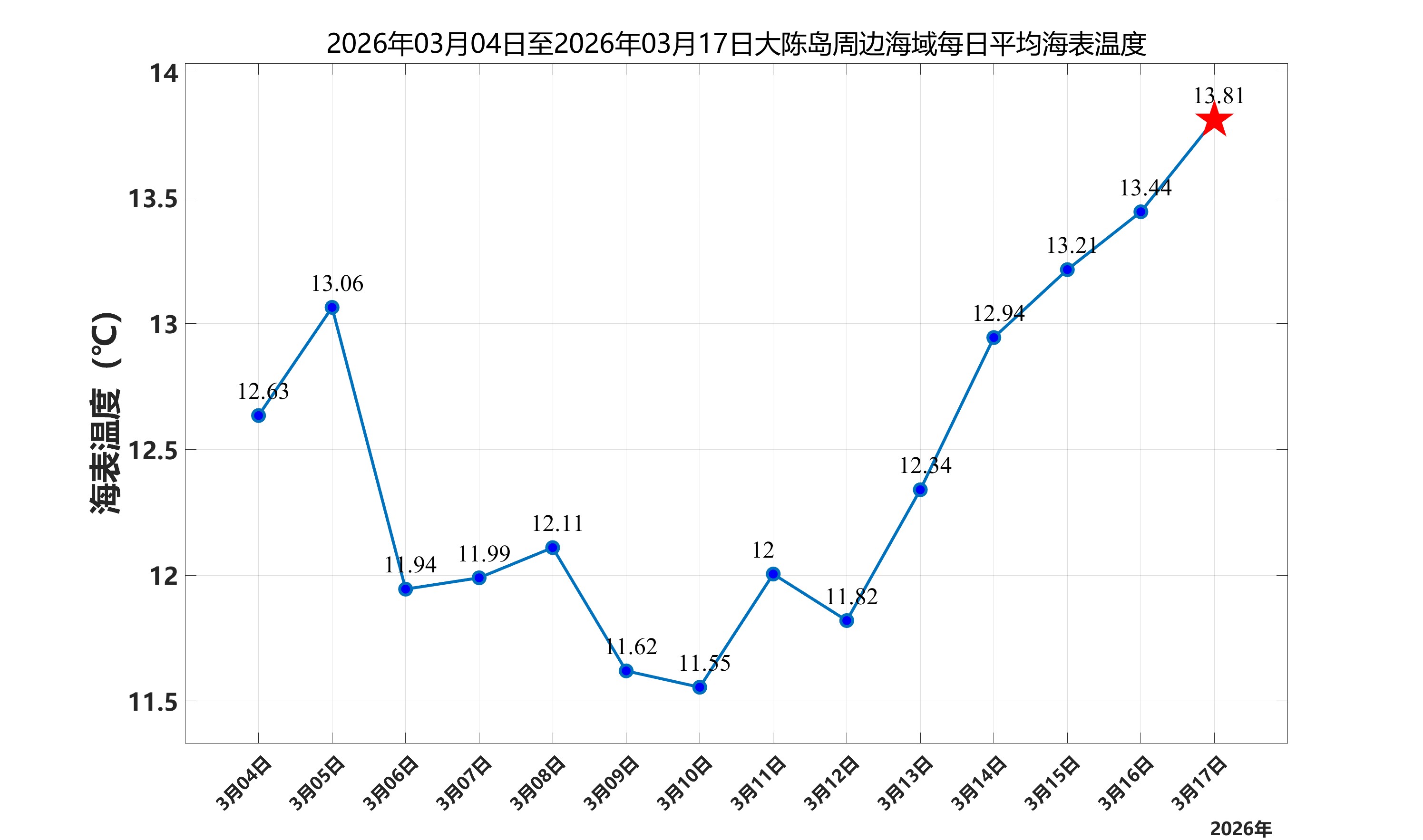 2026年3月17日,大陈岛周边海域日平均海表温度为13.81℃,近两周每日平均海表温度变化如下图所示。