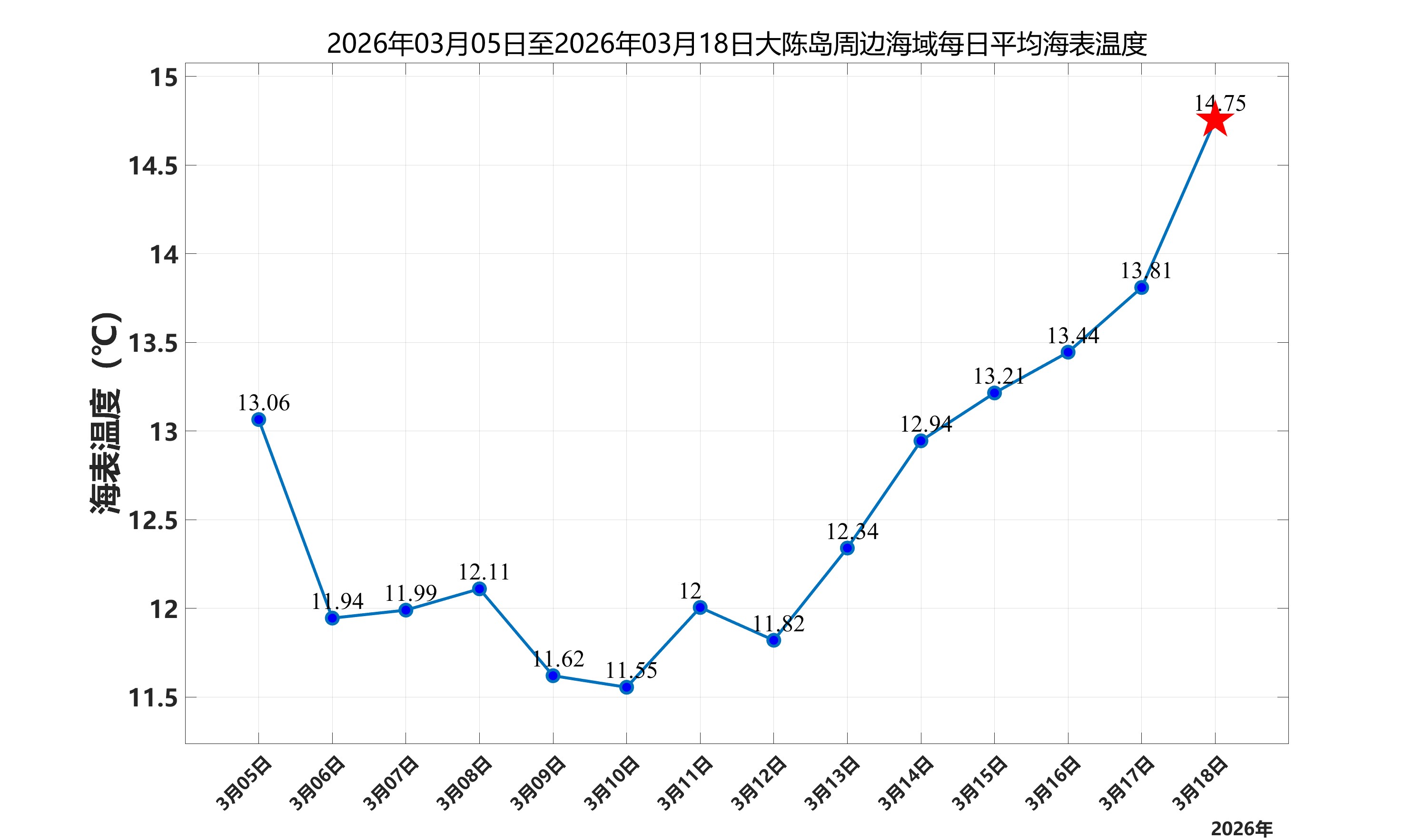 2026年3月18日,大陈岛周边海域日平均海表温度为14.75℃,近两周每日平均海表温度变化如下图所示。