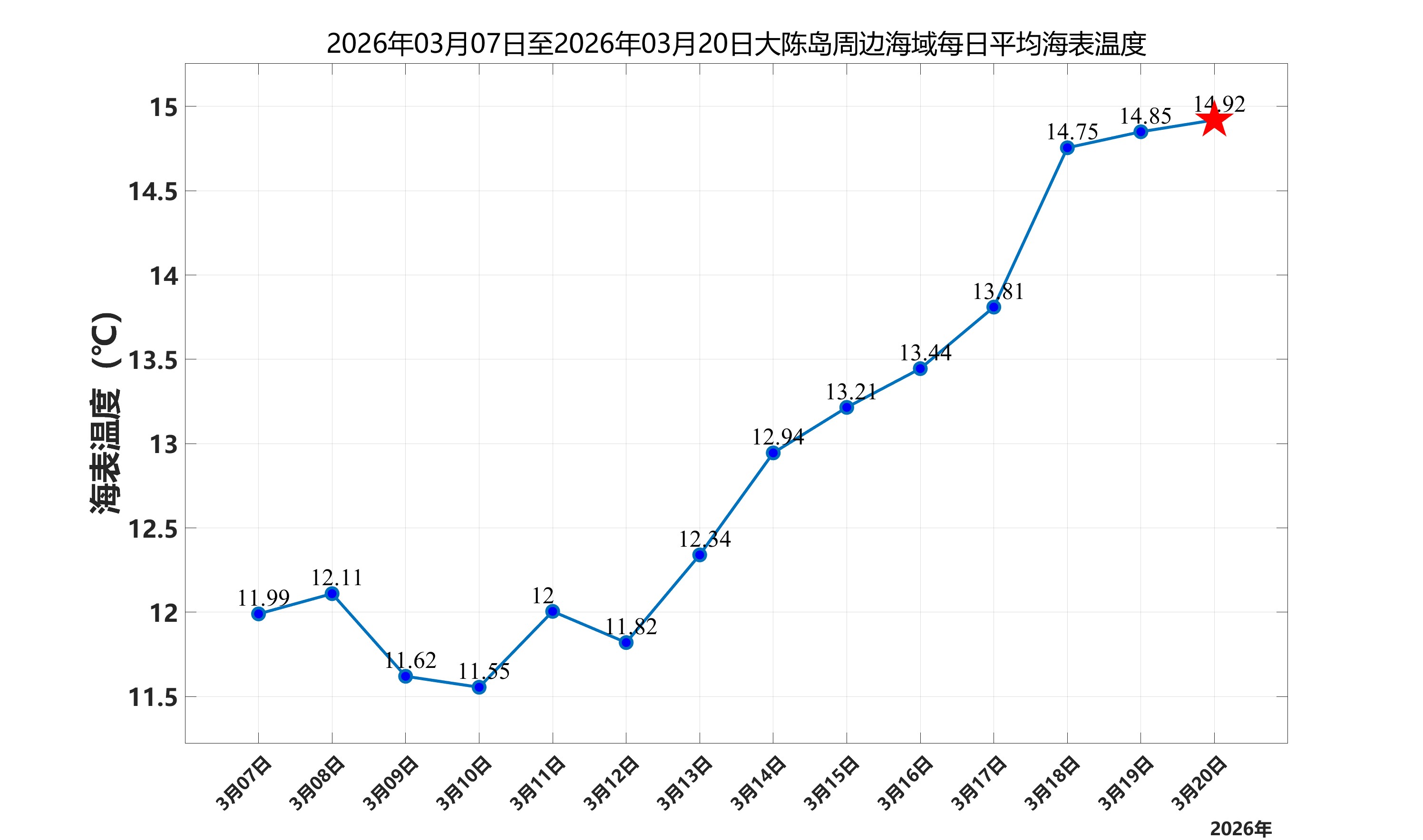 2026年3月20日,大陈岛周边海域日平均海表温度为14.92℃,近两周每日平均海表温度变化如下图所示。