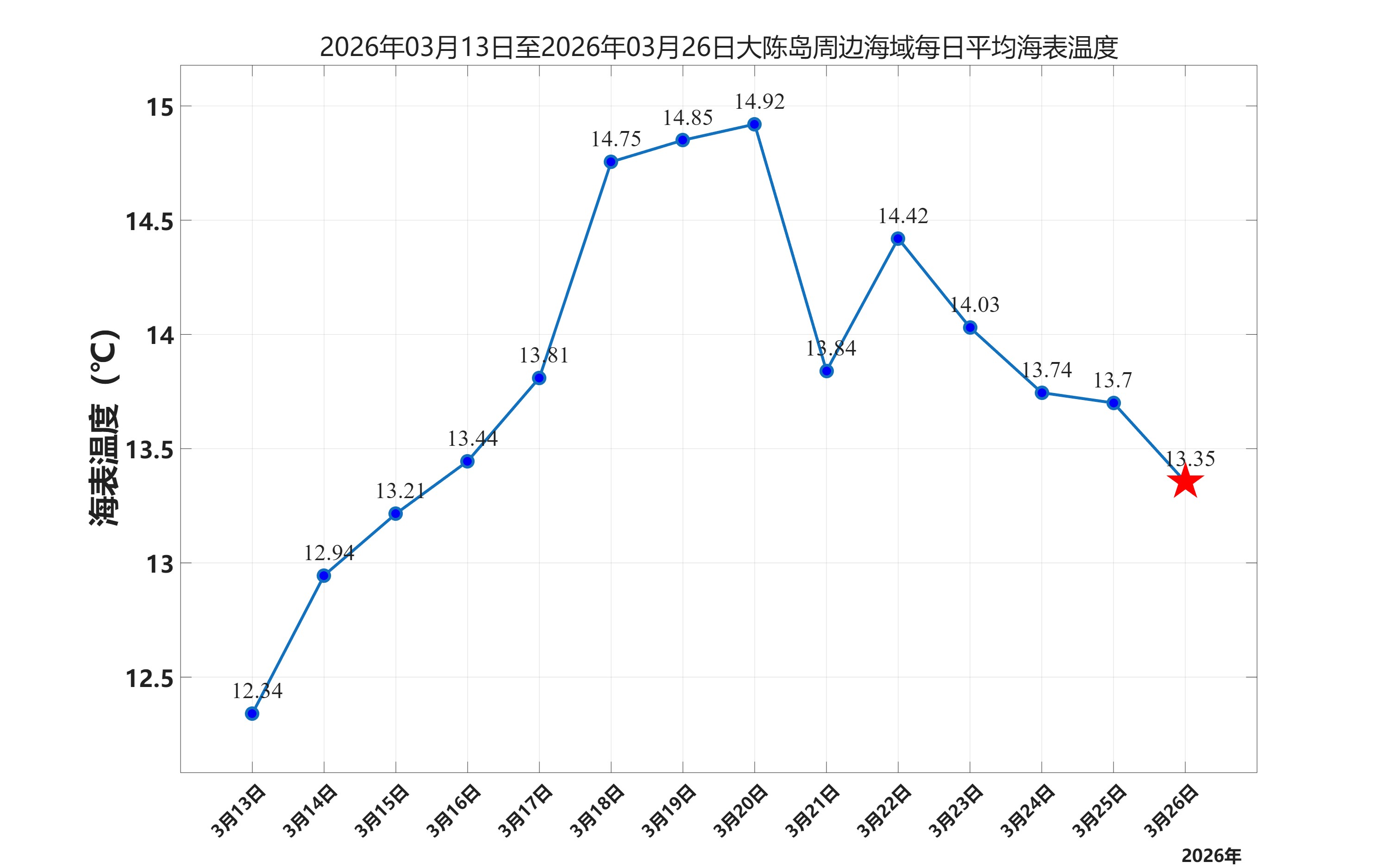 2026年3月26日,大陈岛周边海域日平均海表温度为13.35℃,近两周每日平均海表温度变化如下图所示。