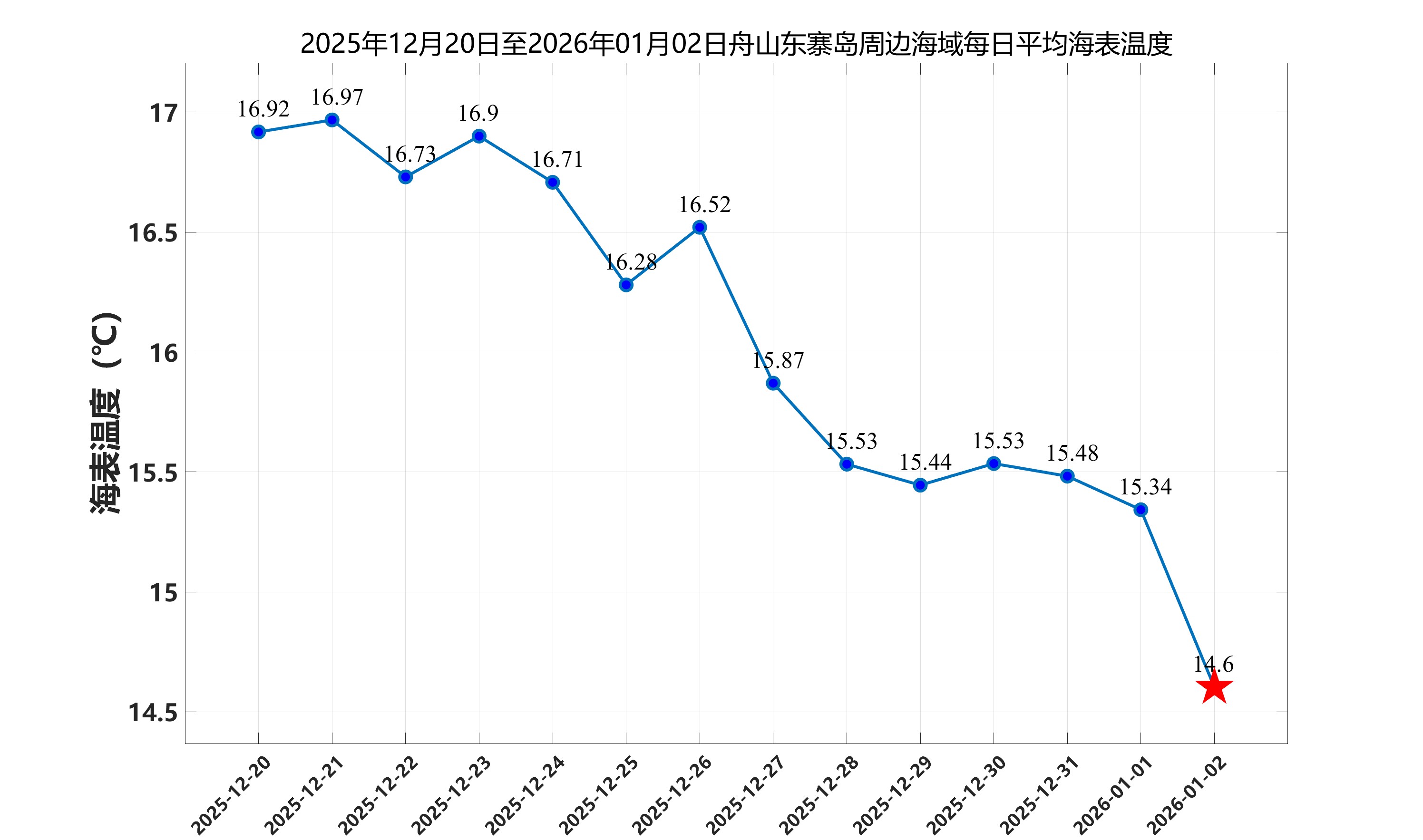 2026年1月2日,舟山东寨岛周边海域日平均海表温度为14.60℃,近两周每日平均海表温度变化如下图所示。