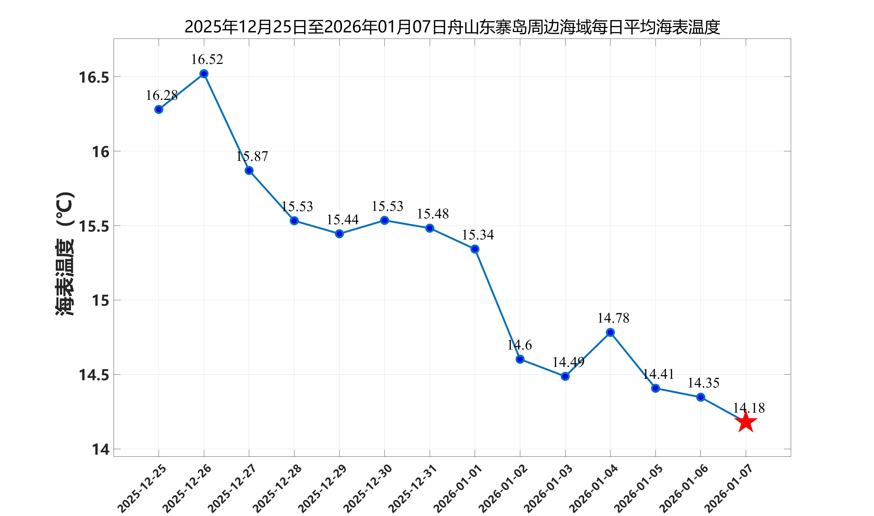 2026年1月7日,舟山东寨岛周边海域日平均海表温度为14.18℃,近两周每日平均海表温度变化如下图所示。