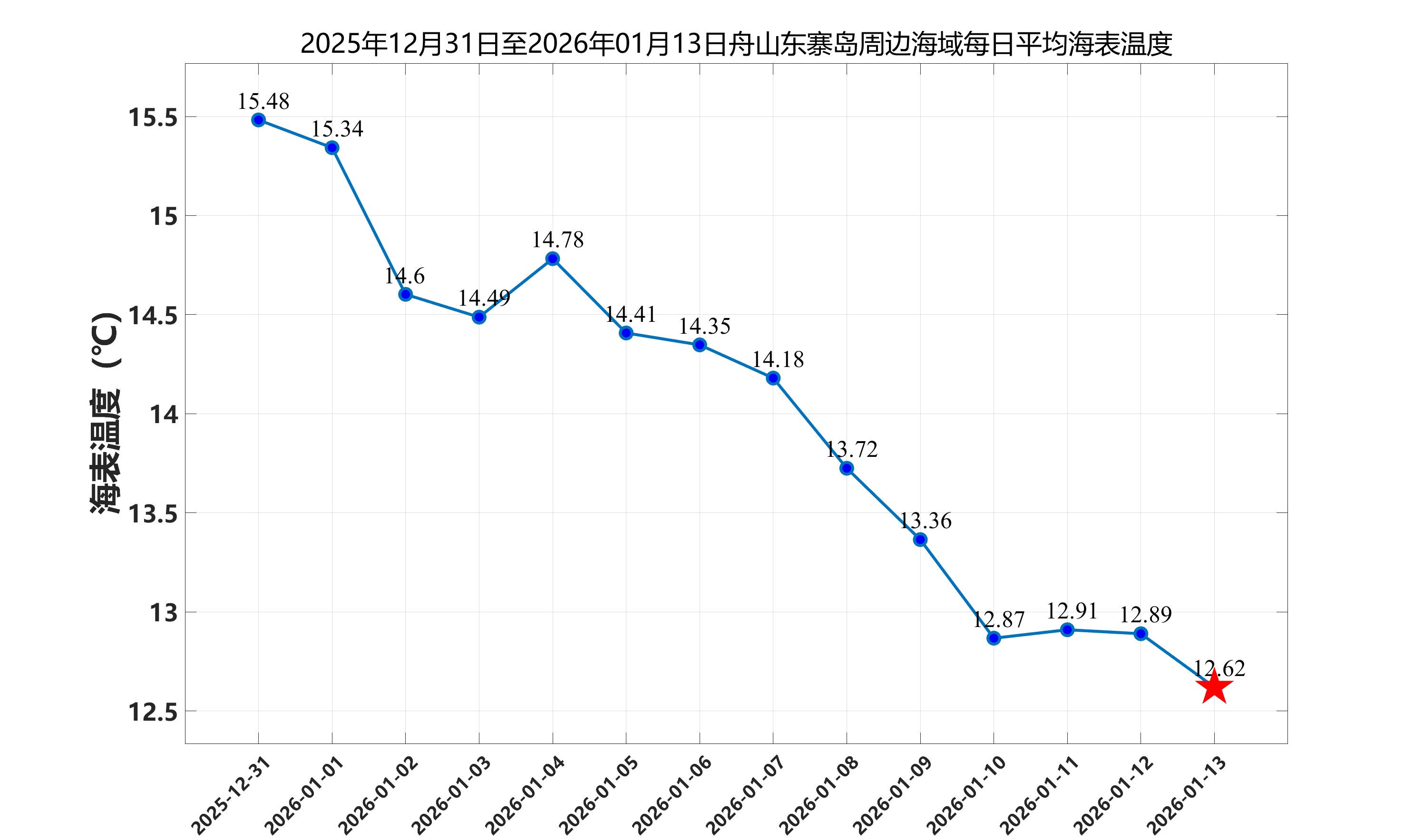 2026年1月13日,舟山东寨岛周边海域日平均海表温度为12.62℃,近两周每日平均海表温度变化如下图所示。