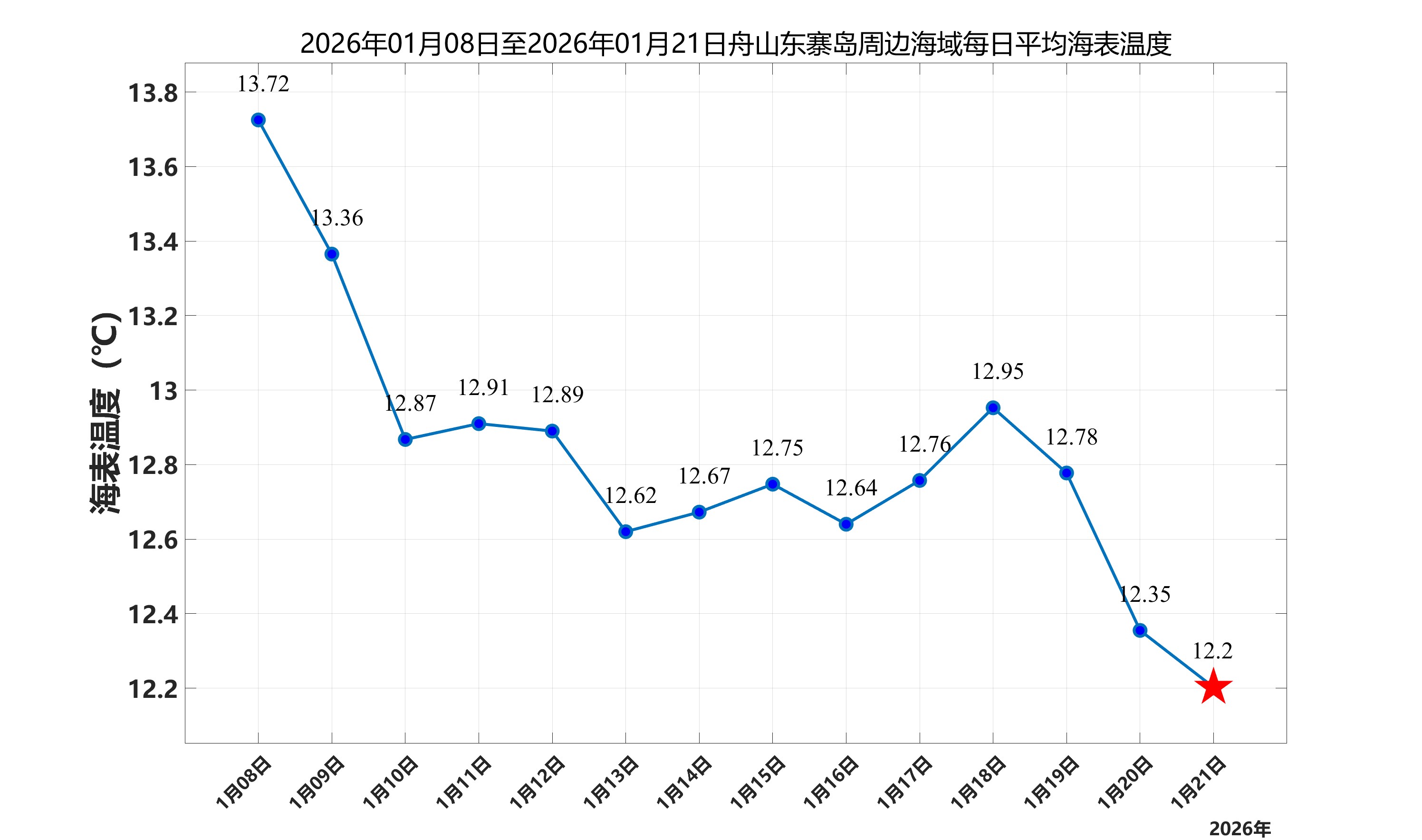 2026年1月21日,舟山东寨岛周边海域日平均海表温度为12.20℃,近两周每日平均海表温度变化如下图所示。