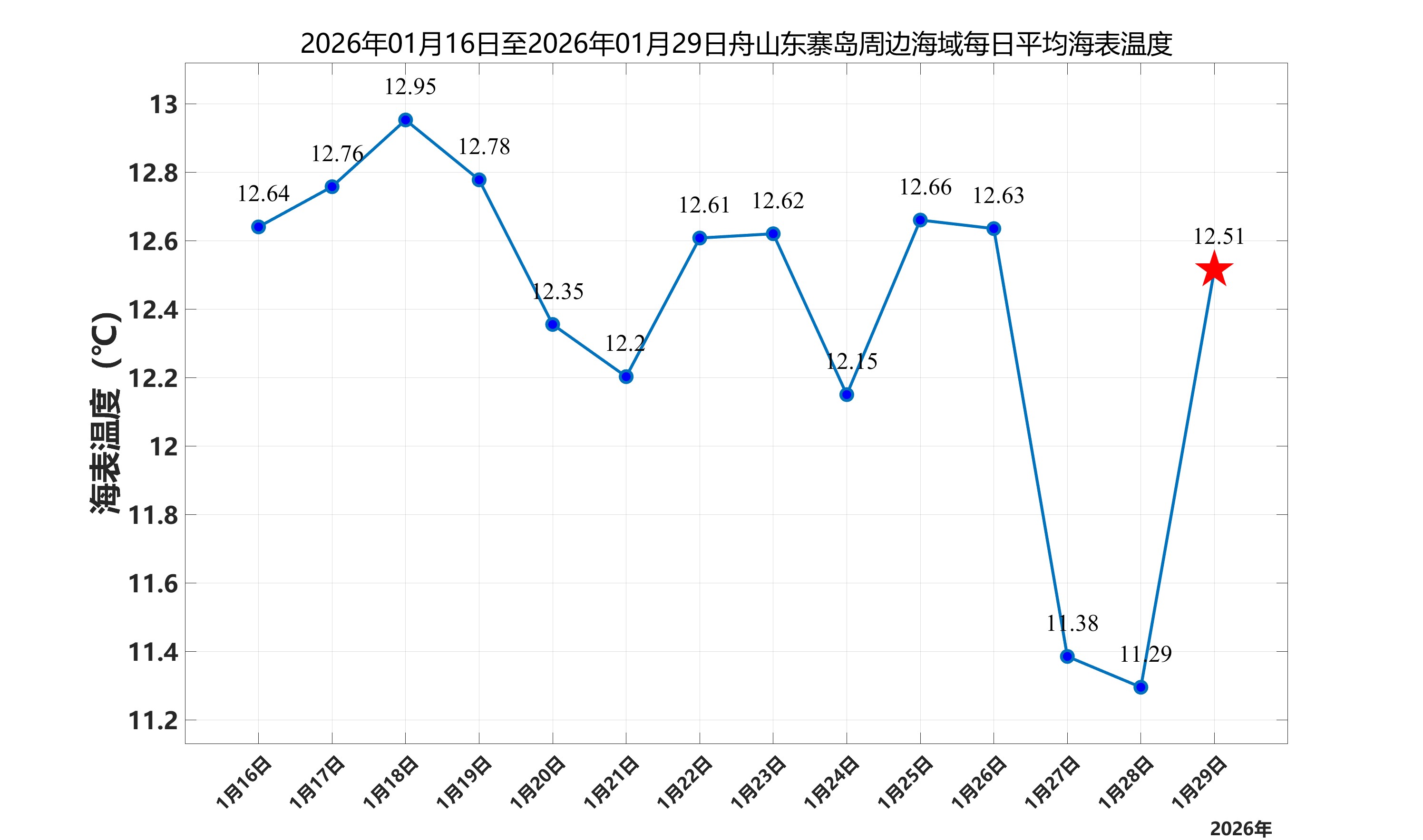 2026年1月29日,舟山东寨岛周边海域日平均海表温度为12.51℃,近两周每日平均海表温度变化如下图所示。