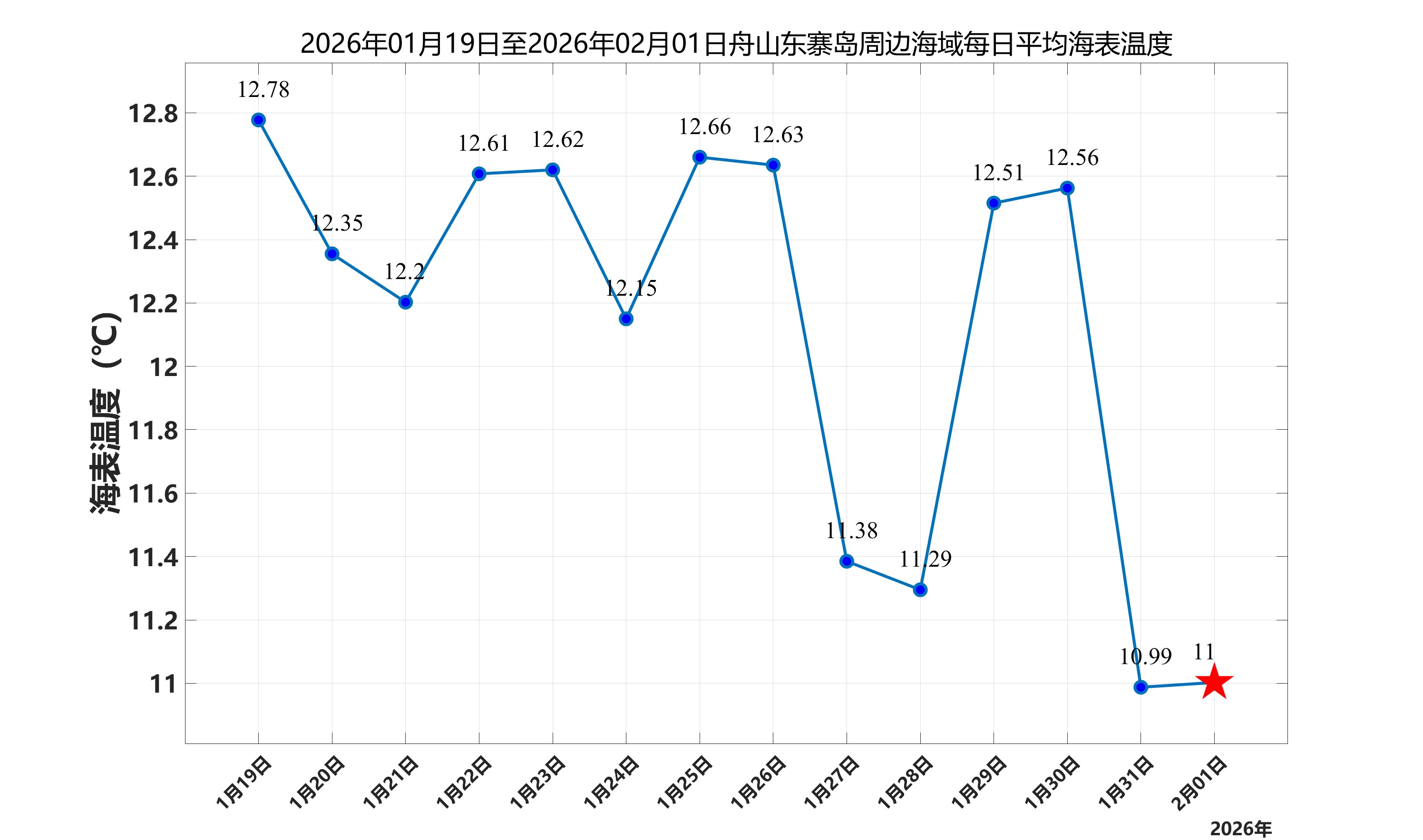2026年2月1日,舟山东寨岛周边海域日平均海表温度为11.00℃,近两周每日平均海表温度变化如下图所示。
