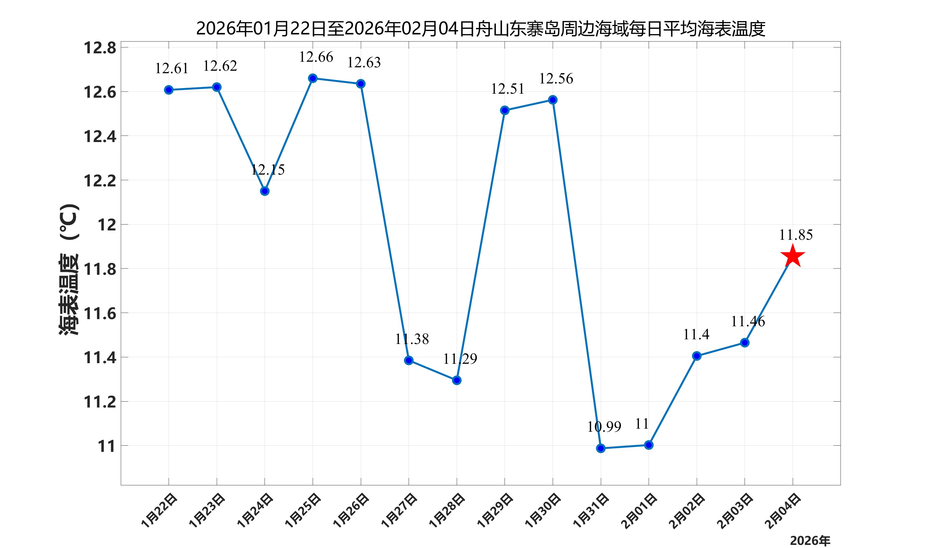 2026年2月4日,舟山东寨岛周边海域日平均海表温度为11.85℃,近两周每日平均海表温度变化如下图所示。