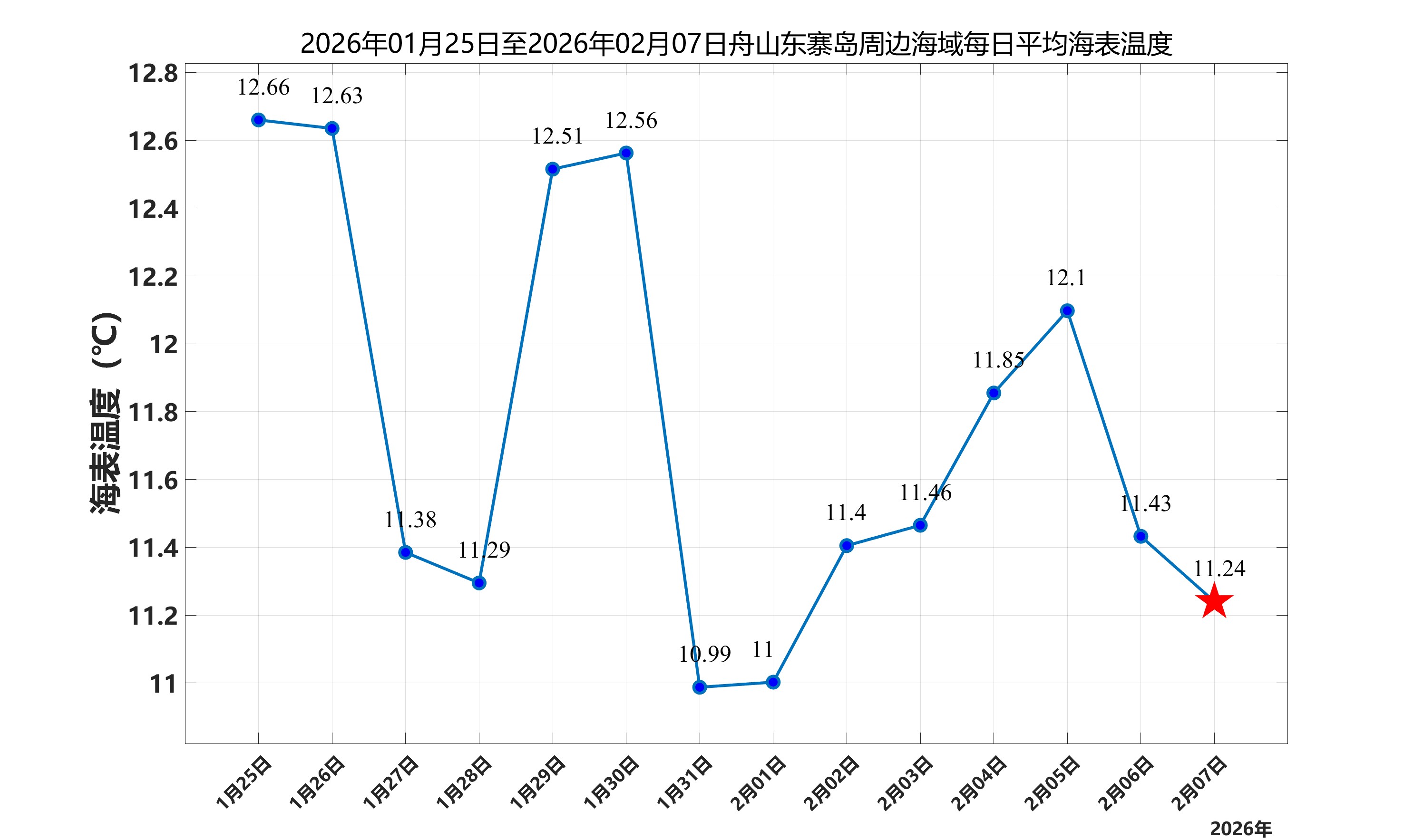 2026年2月7日,舟山东寨岛周边海域日平均海表温度为11.24℃,近两周每日平均海表温度变化如下图所示。