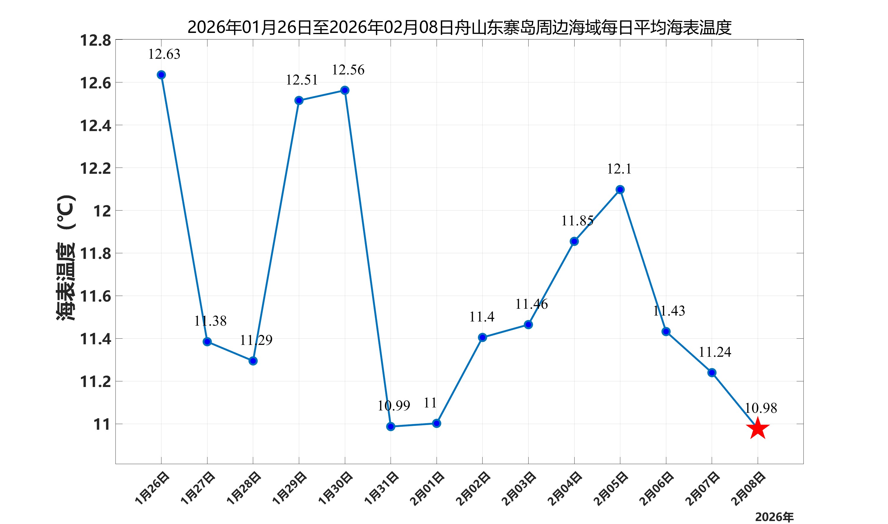 2026年2月8日,舟山东寨岛周边海域日平均海表温度为10.98℃,近两周每日平均海表温度变化如下图所示。