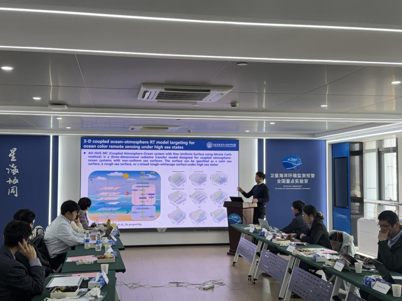 访问期间,双方就静止轨道海洋水色卫星遥感技术开展了深入的交流与研讨。来自韩国海洋卫星中心、釜山大学的5位遥感专家针对静止水色卫星遥感器GOCI-II观测资料,分享了大气校正算法、水体固有光学量/盐度反演方法以及溢油、水质、赤潮等遥感方面的研究成果。海洋二所科技处处长白雁研究员、我室何贤强研究员、王迪峰研究员、陶邦一研究员以及东海实验室丁小松博士,分别围绕海洋碳通量遥感评估、高轨卫星辐射传输模型与大气校正算法、水质遥感监测、赤潮遥感识别、海表流场遥感提取等内容进行了成果分享与交流。
