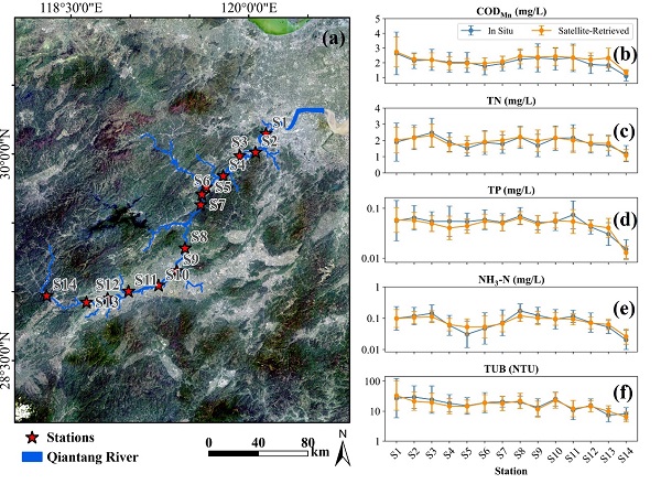 Figure 2. Variations of satellite-retrieved values and in-situ measured values at stations along the Qiantang River with station locations