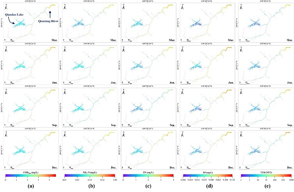 Figure 4. Remote sensing monitoring of water quality parameter concentrations in the Qiantang River Basin (2016 ~ 2023 average results). (a) Permanganate index, (b) Ammonia nitrogen, (c) Total nitrogen, (d) Total phosphorus, (e) Turbidity