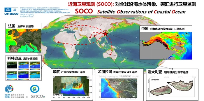 The SOCO project is anchored under the United Nations "Ocean Decade" flagship program CoastPredict, which aims to advance understanding and predictive capacity of coastal marine ecosystems, services, and biodiversity through coordinated global coastal observation and forecasting. Initiated and led by Researcher He Xianqiang of our laboratory, the SOCO project is jointly implemented with researchers from France, Australia, India, Bangladesh, Côte d’Ivoire, and other countries. With a global coverage of major coastal seas, SOCO’s core objective is to enhance satellite monitoring capabilities for water pollution, carbon sinks, and ecosystem health in coastal regions worldwide. Leveraging the global observational advantages and retrospective capacity of remote sensing technology, the project will monitor the evolution of coastal water environments and ecosystem health under the dual impacts of human activities and climate change, providing scientific support for coastal ecological protection, biodiversity conservation, and sustainable development decision-making. SOCO plans to first carry out satellite observation demonstrations in coastal regions including China, France, Australia, India, Bangladesh, and Côte d’Ivoire (Figure 1), realizing the global promotion and application of high-resolution satellite remote sensing monitoring technologies for coastal water pollution and carbon sinks developed by our laboratory.
